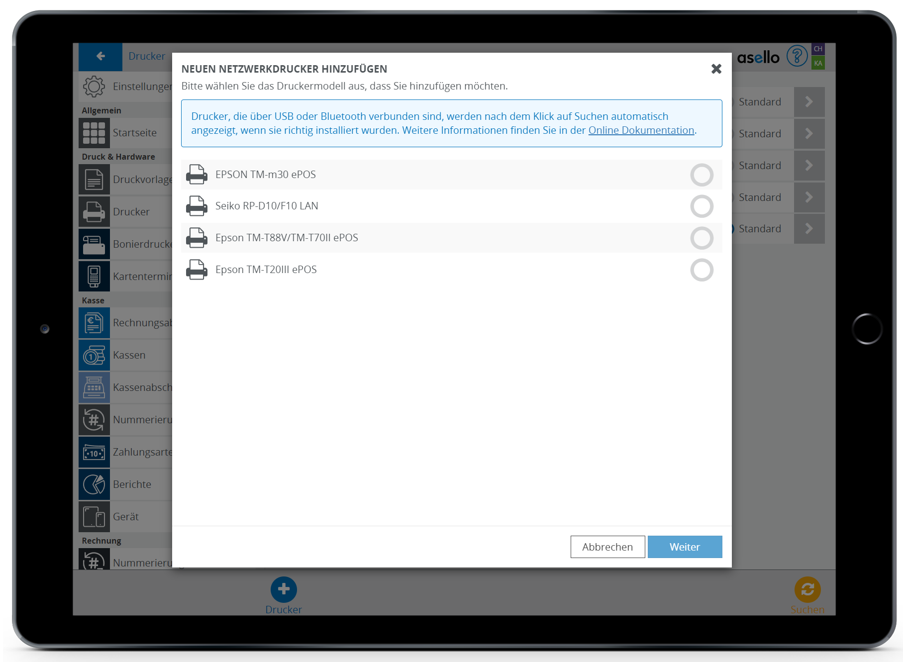 LAN und WLAN Drucker können über blauen Button "+ Drucker" im linken unteren Eck hinzugefügt werden. Es erscheint nun ein Pop-Up-Fenster indem Sie den Drucker auswählen müssen, den Sie hinzufügen möchten. Setzten Sie dafür ein grünes Häkchen am Ende der Zeile des jeweiligen Druckers und klicken Sie anschließend auf den blauen Button "Weiter" im rechten unteren Eck.