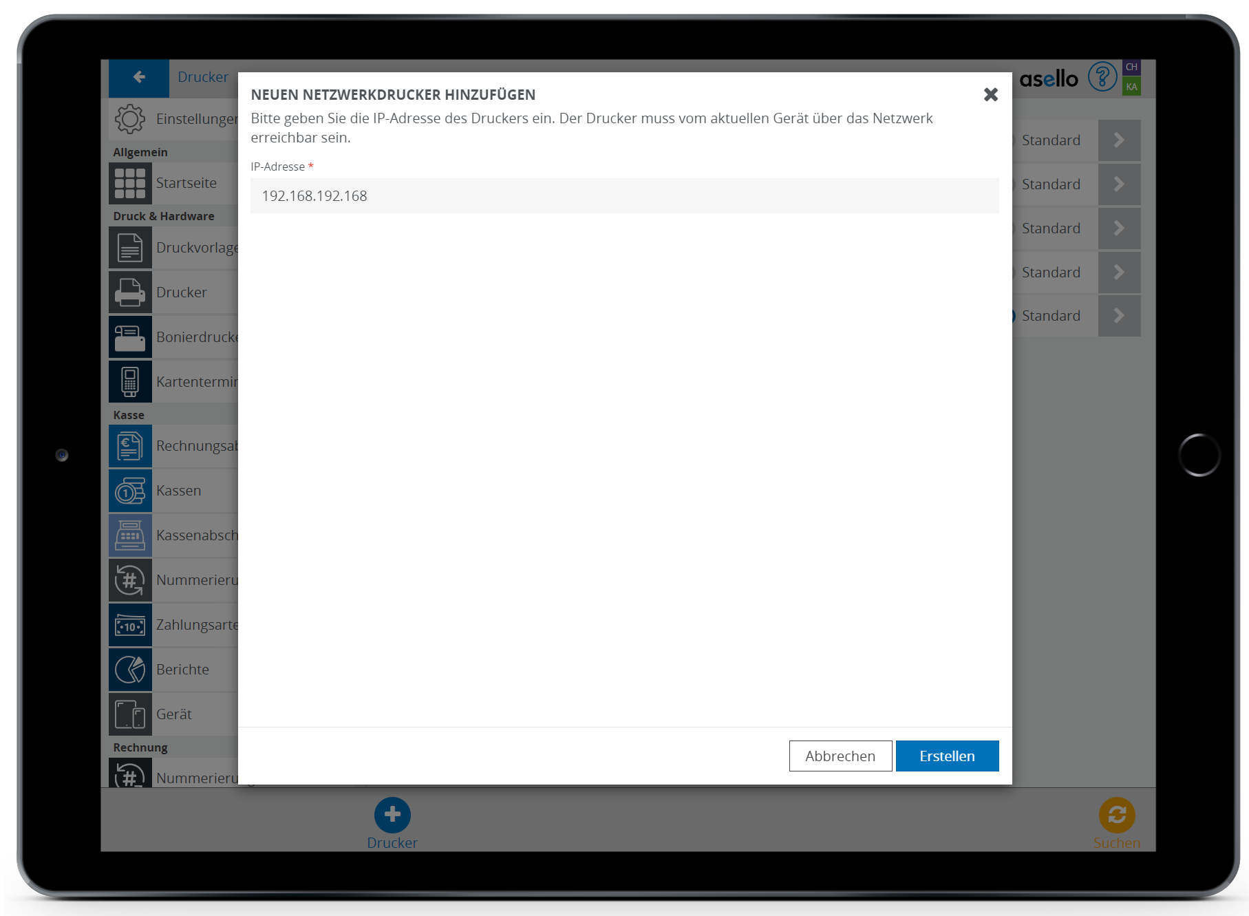 Nun müssen Sie die IP-Adresse des Druckers eingeben. Danach klicken Sie auf den blauen Button "Erstellen", um den Drucker abschließend anzulegen.