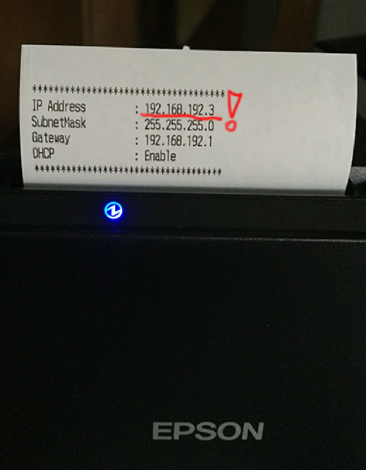 Die IP Adresse Ihres Drucker können Sie bei Einschalten ihres Druckers am Ausdruck erkennen. Im Bild ist die IP Adresse rot unterstrichen.