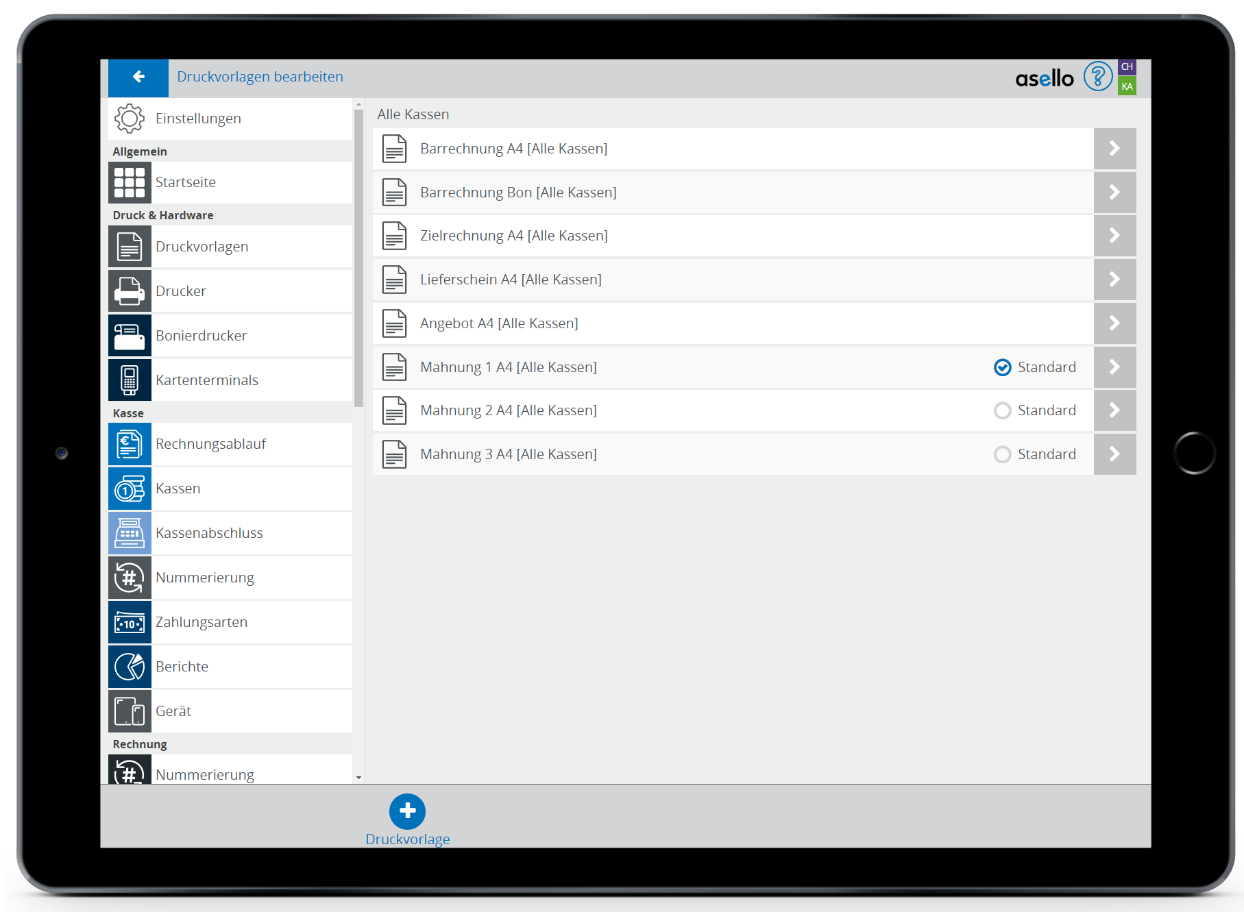 aselloPOS prüft immer zuerst ob eine individuelle Vorlage für eine Kasse erstellt wurde und wendet diese an, wenn eine solche vorhanden ist. Erst wenn aselloPOS keine individuelle Vorlage für eine Kasse findet, wird auf die allgemeine Vorlage (alle Kassen) zurückgegriffen.
