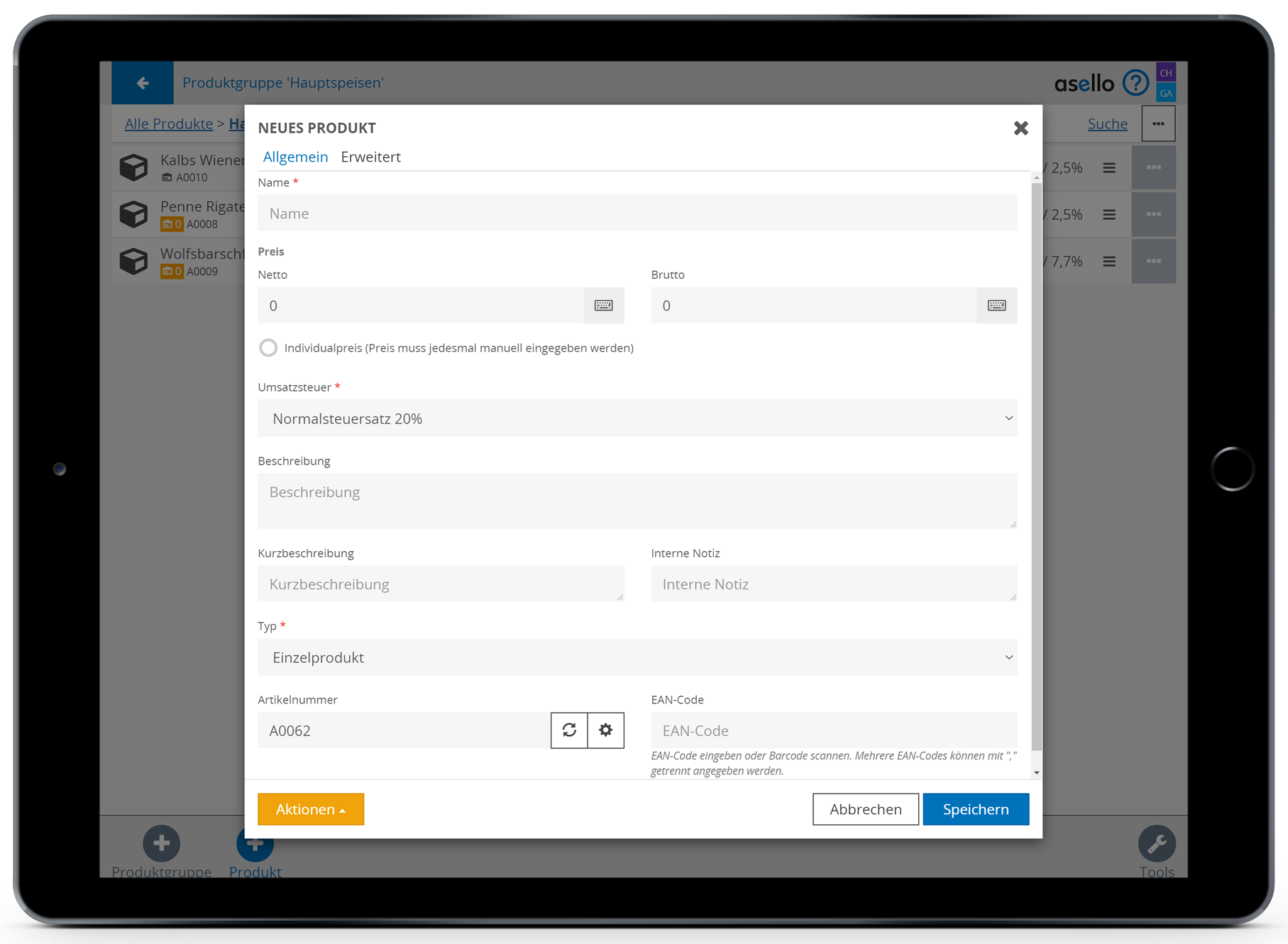 Um ein Einzelprodukt zu erstellen, klicken Sie auf die Kachel „Produkte" und wähle die Produktgruppe aus, unter welche das Produkt fällt.