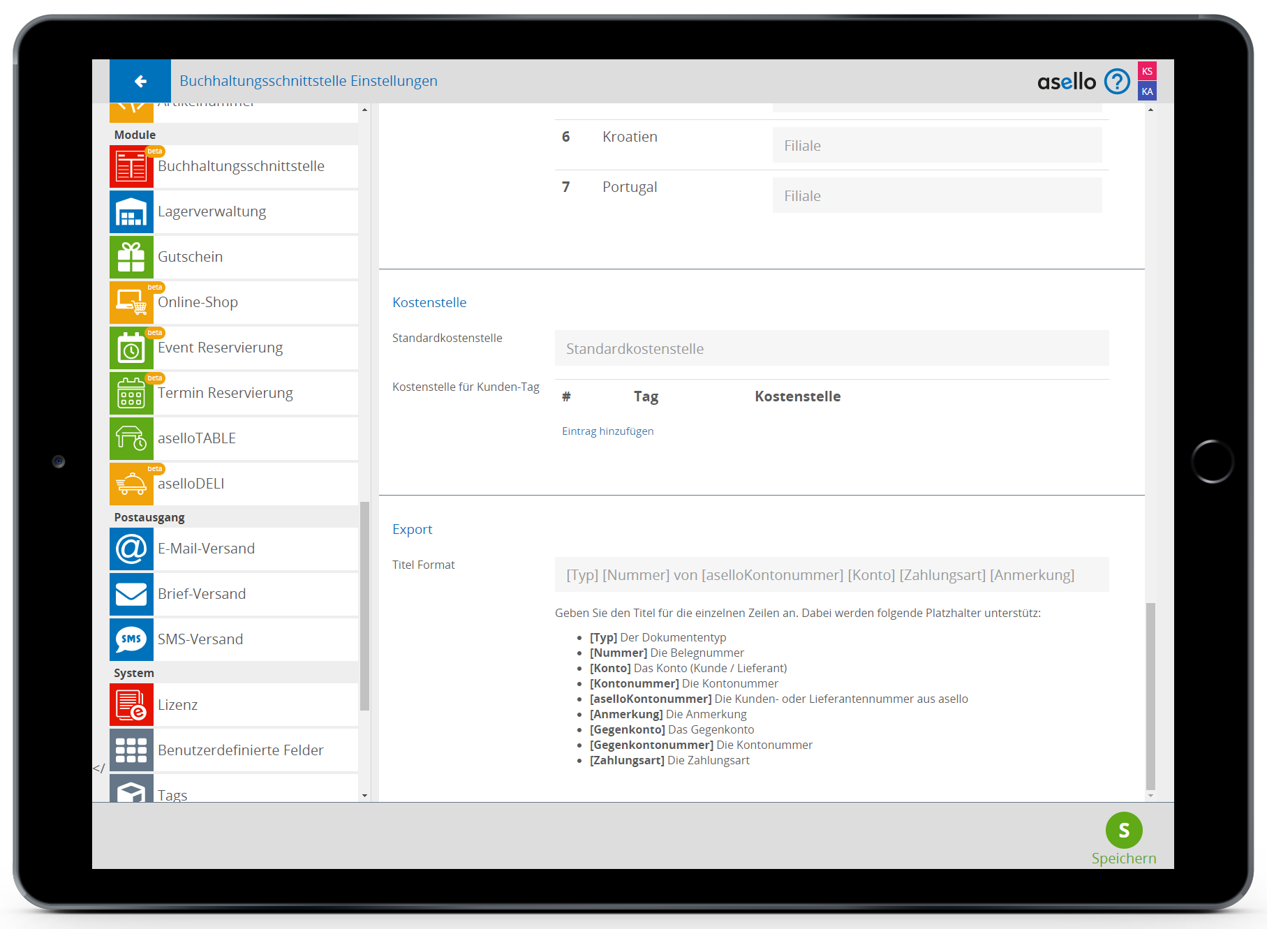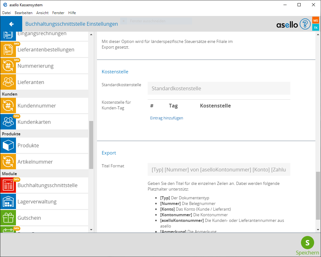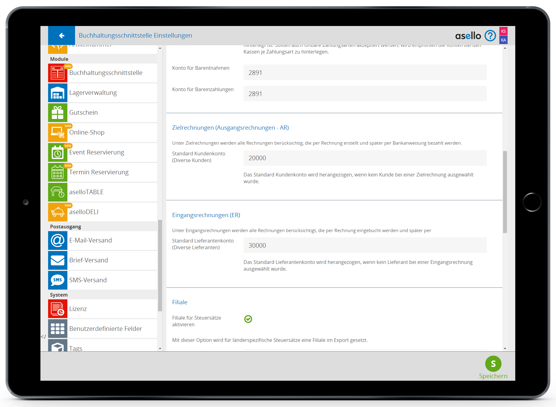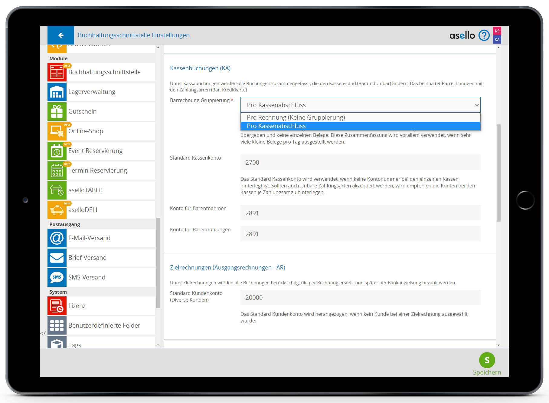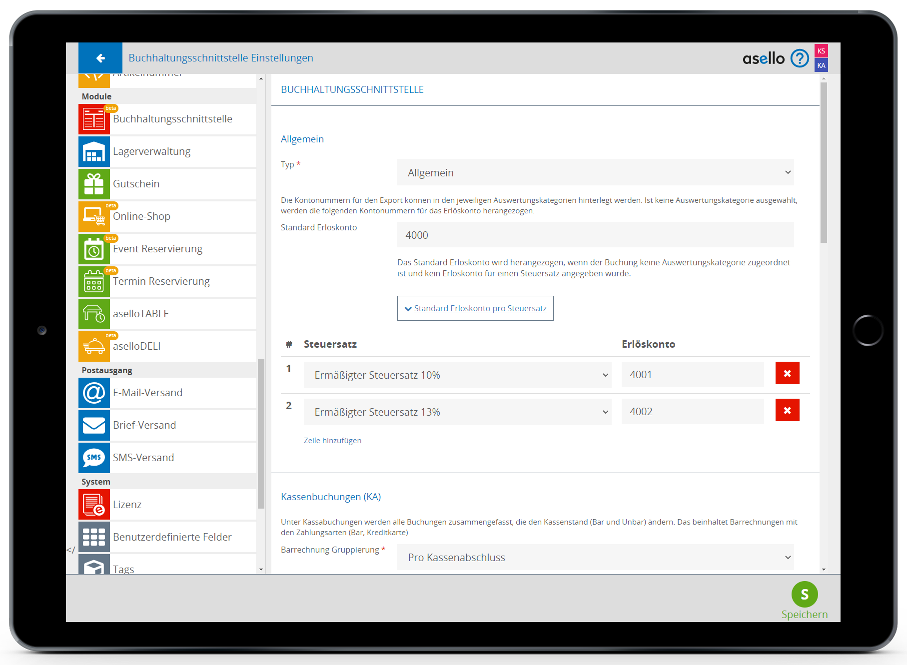 Um das asello Zusatzmodul „Buchhaltungsschnittstelle" zu nutzen, müssen Sie in verschiedenen Bereichen Konfigurationen vornehmen.