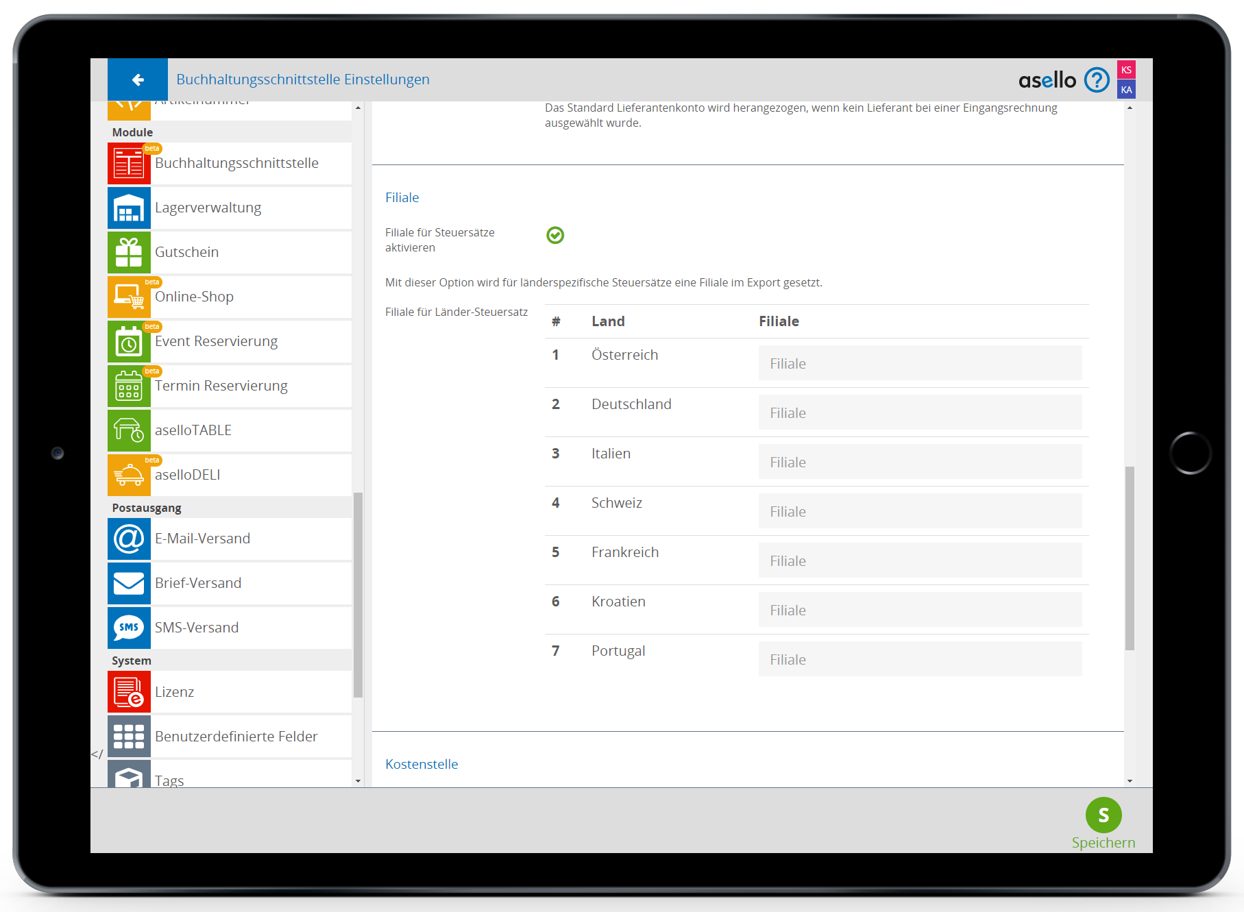Mit dem Setzten des grünen Häkchens hinter „Filiale für Steuersätze aktivieren“, können Sie Ihre inländischen Rechnungen und Rechnungen von oder an Firmen im Ausland trennen.