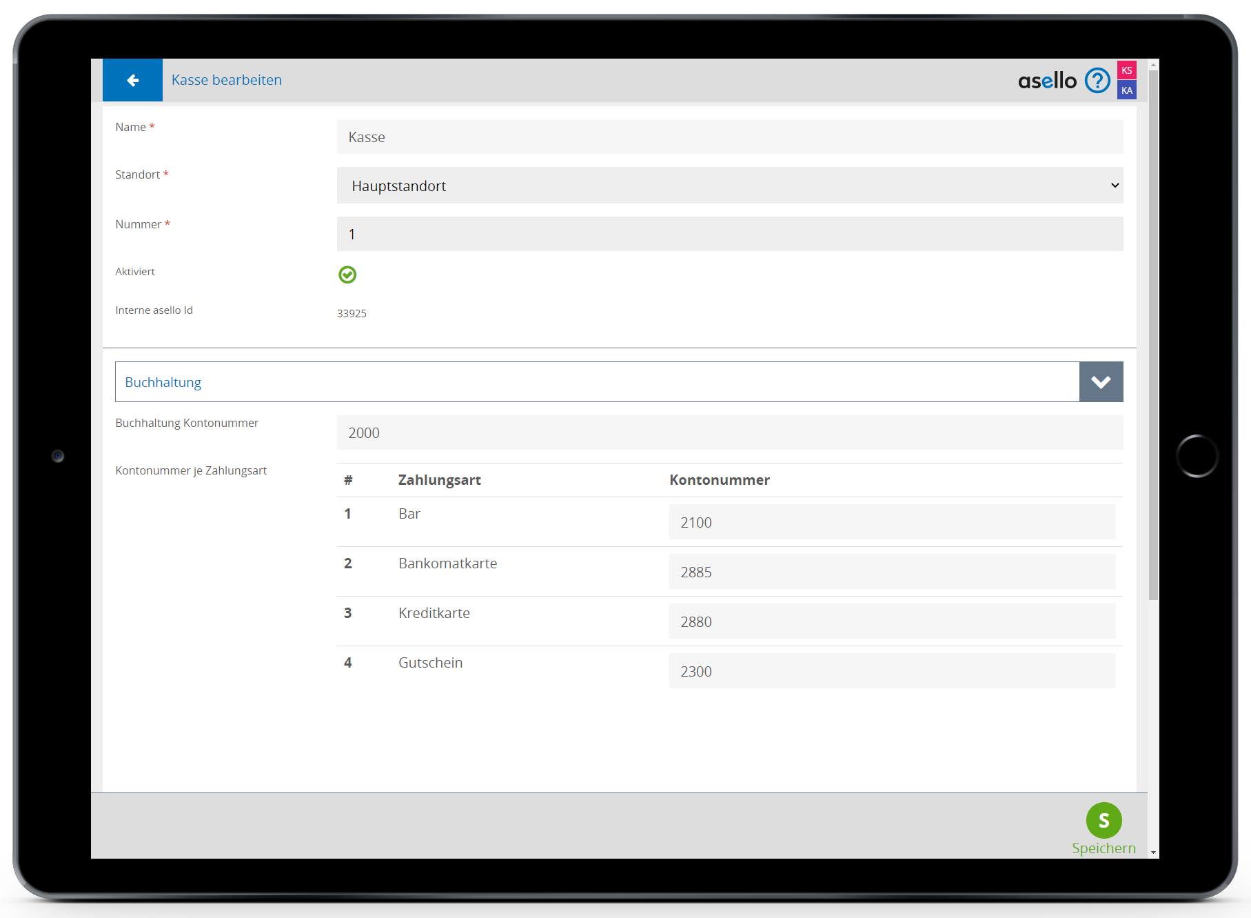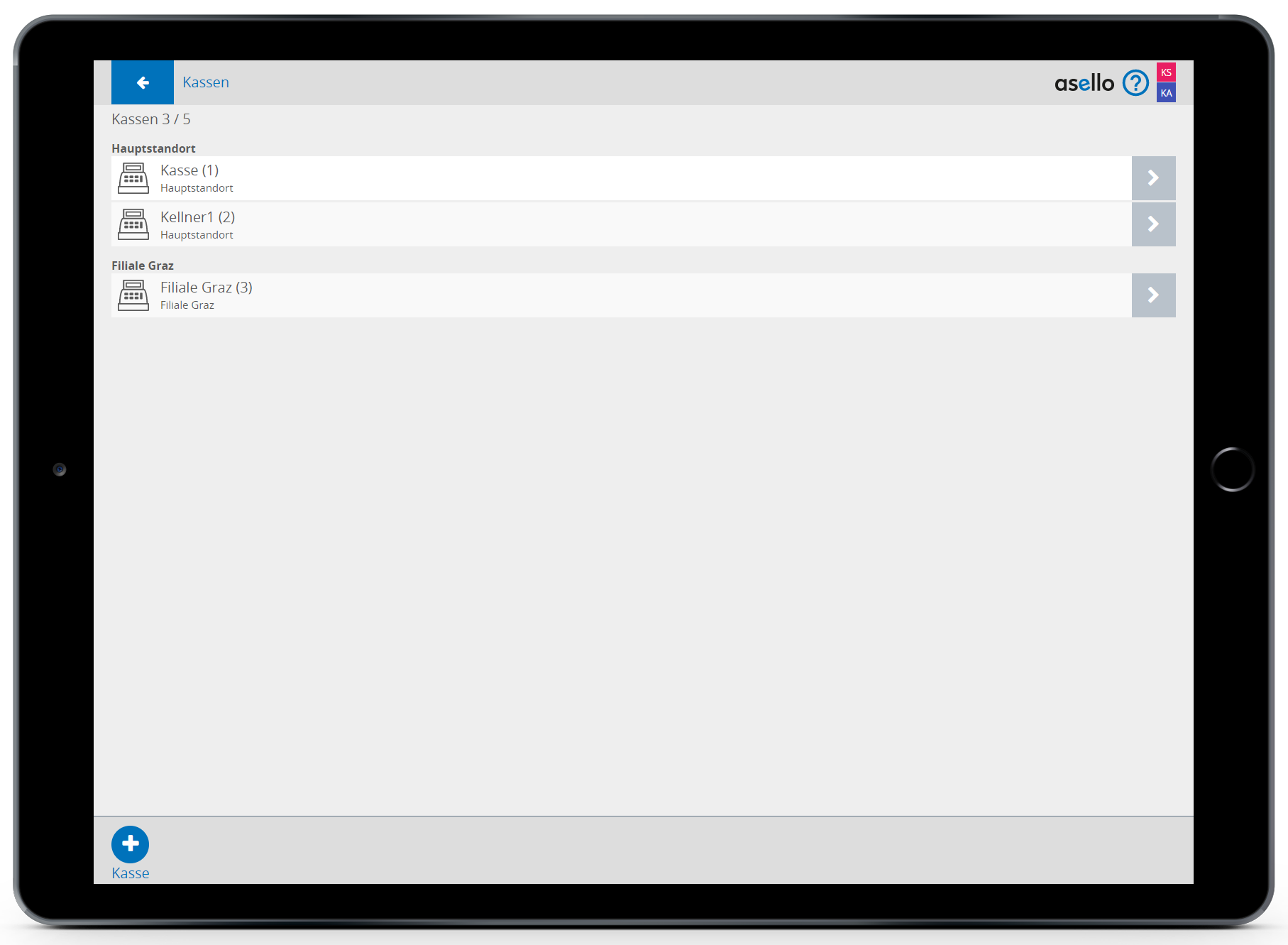 Um das Zusatzmodul „Buchhaltungsschnittstelle" nutzen zu können müssen Sie auch in der Kasse Konfigurationen vornehmen. Dazu klicken Sie auf der asello Startseite auf die graue Kachel „Stammdaten“ und anschließend auf die blaue Kachel „Kassen“. Nun sollten Sie folgende Seite sehen.