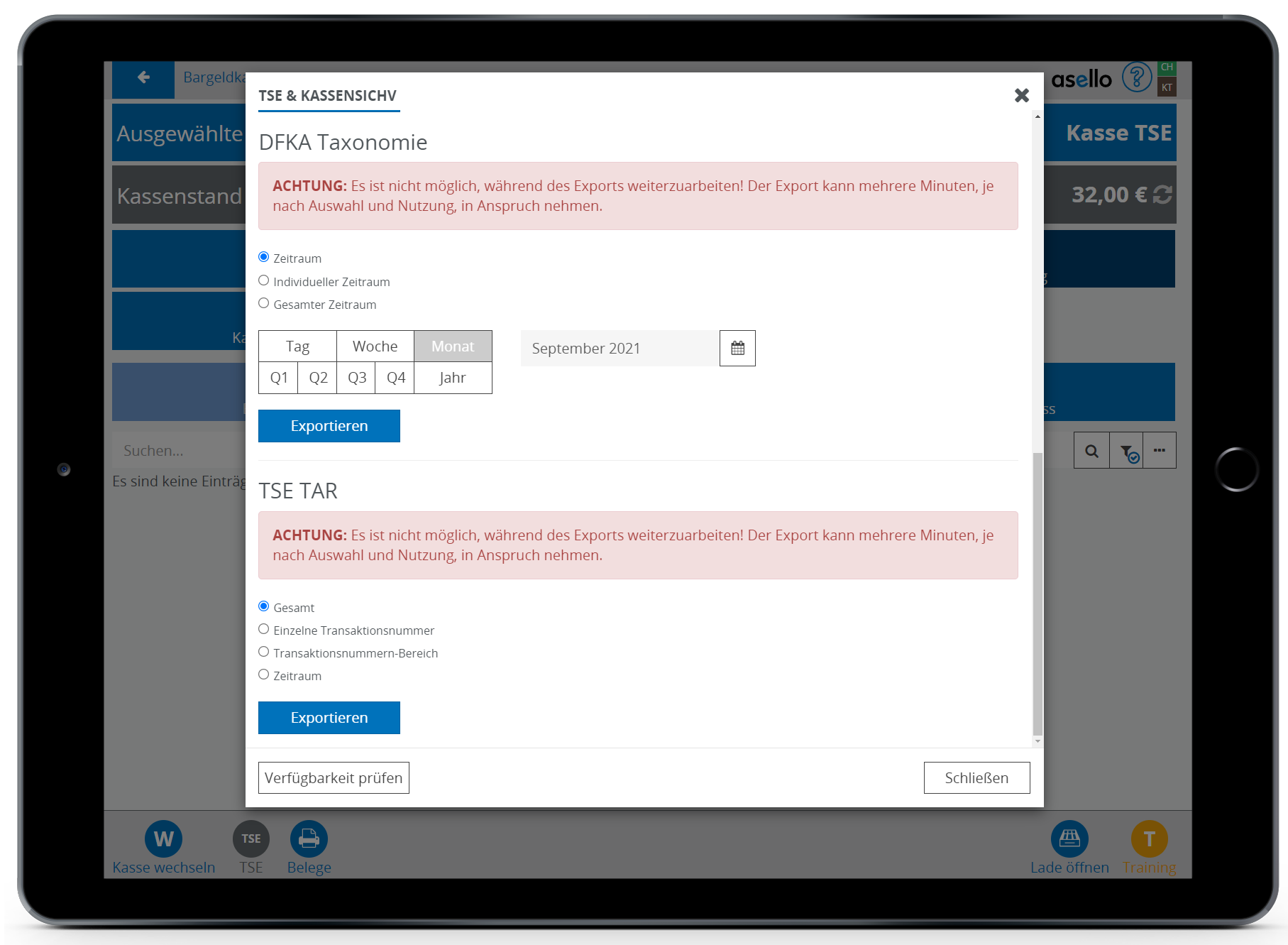 Während die Daten aus dem TAR-Archiv exportiert werden, kann die jeweilige Kasse nicht verwendet werden. Erst nachdem die Daten exportiert wurde kann die Kasse wieder zu einer ordnungsgemäßen Aufzeichnung verwendet werden. Der TAR Export kann je nach Datenmenge einige Minuten in Anspruch nehmen.