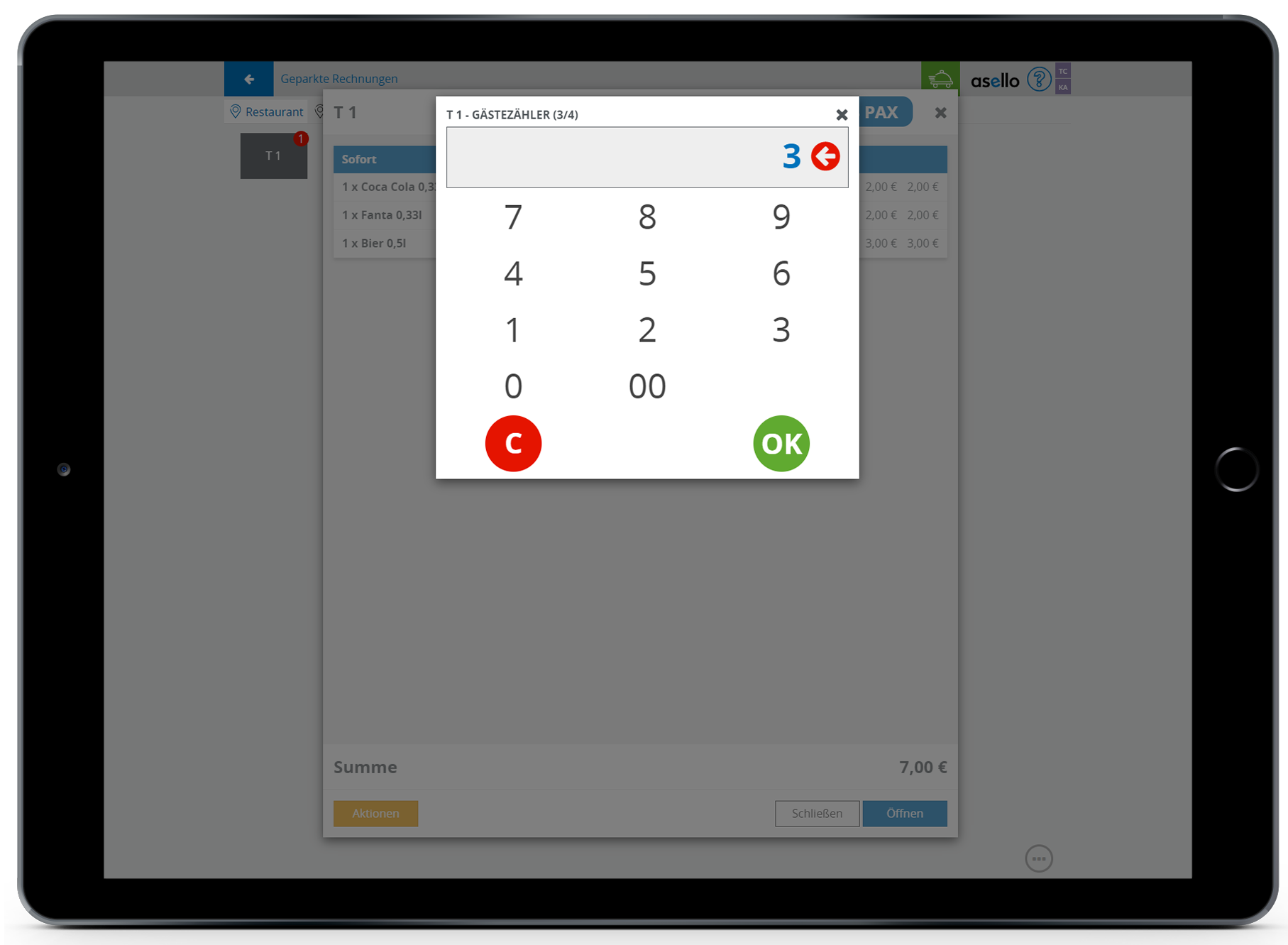 Um die Gästeanzahl einzugeben öffnen Sie zuerst den gewünschten Tisch. Im rechten oberen Eck finden Sie den "PAX"-Button. Klicken Sie darauf um im neuen Fenster die Gästeanzahl des gewählten Tisches einzugeben. Die Eingabe kann mit der grünen "OK"-Taste übernommen werden.