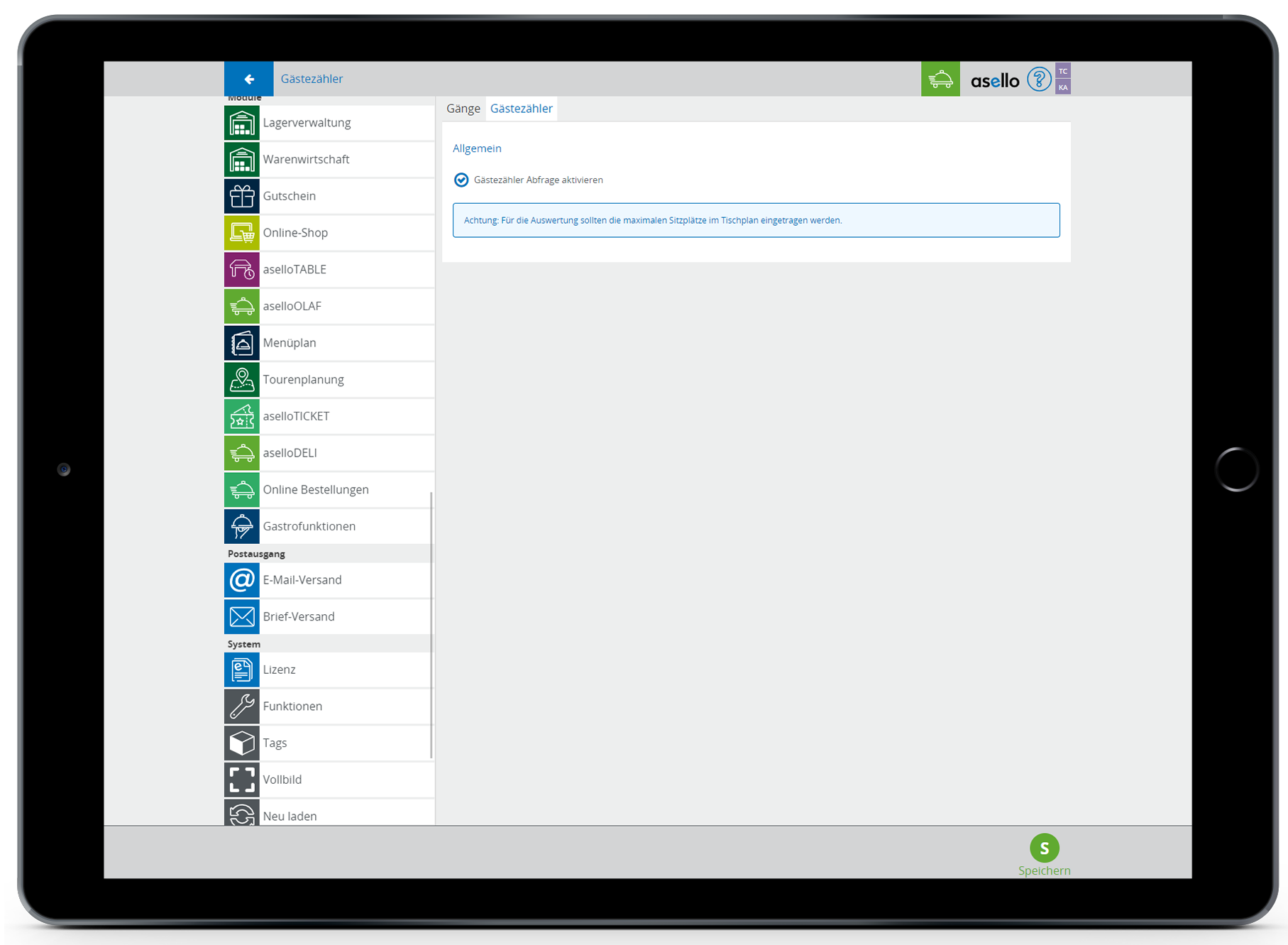 Sie können die Gästeanzahl automatisch beim Parken eines Beleges auf einen Tisch abfragen. Öffnen Sie dazu die Einstellungen und scrollen Sie bis zum Abschnitt Module. Klicken Sie auf den Punkt "Gastrofunktionen" und wählen Sie den Reiter "Gästezähler". Hier können Sie mit dem Häckchen bei "Gästezähler Abfrage aktivieren" einstellen, ob sich beim Parkvorgang die Abfrage zur Gästeanzahl automatisch öffnen soll.
