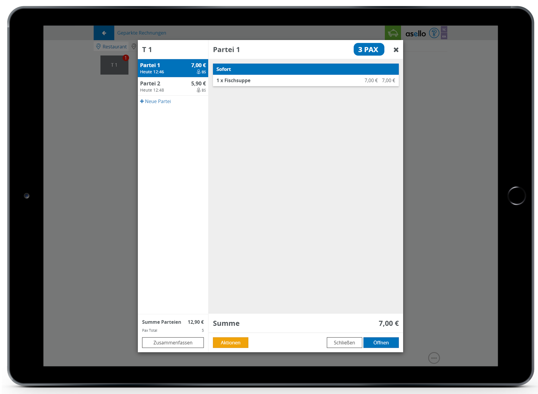 Haben Sie mehrere Parteien für die Tische aktiviert, kann für jede Partei die Gästeanzahl getrennt eingegeben werden. Die Summe aller Gäste des Tisches sehen Sie im linken Abschnitt des Tisch-Detailfensters über der Summe.