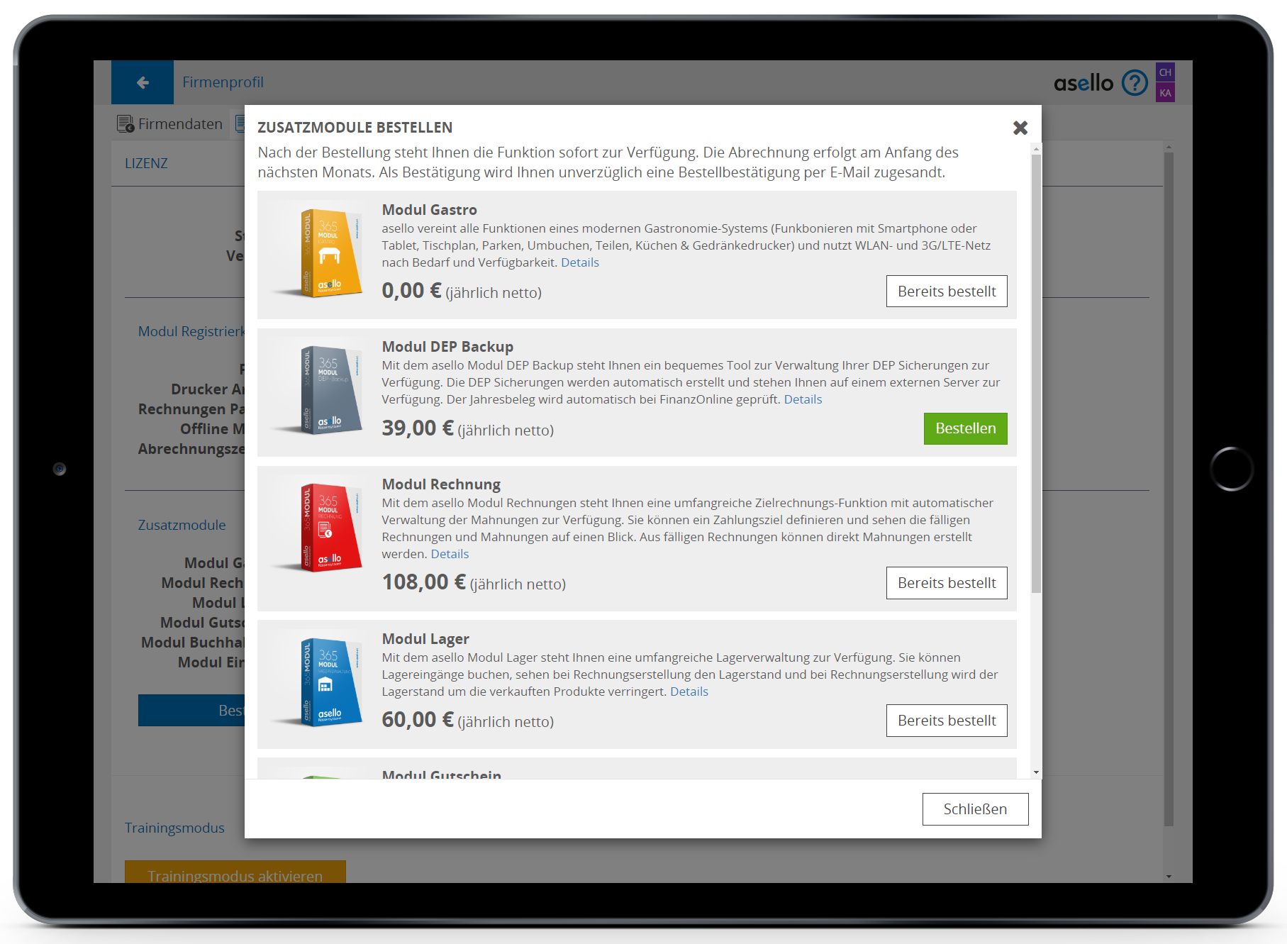 Als ersten Schritt müssen Sie überprüfen ob Sie das asello Modul „Rechnung“ bereits bestellt und aktiviert ist. Dazu klicken Sie in der oberen Leiste auf den Punkt „Lizenz“. Im Unterpunkt Zusatzmodule können Sie nun sehen, welche Module Sie bestellt haben. Sollte Sie das Modul „Rechnung“ nicht so wie in diesem Fall aufgezählt und mit einem Häkchen dahinter sehen, so klicken Sie auf den blauen Button „Bestellen“ unterhalb. Anschließend klicken Sie bei dem gewünschten Modul auf den grünen Button „Bestellen“. Sollten Sie das Modul bereits bestellt haben so steht an dieser Stelle „Bereits bestellt“.