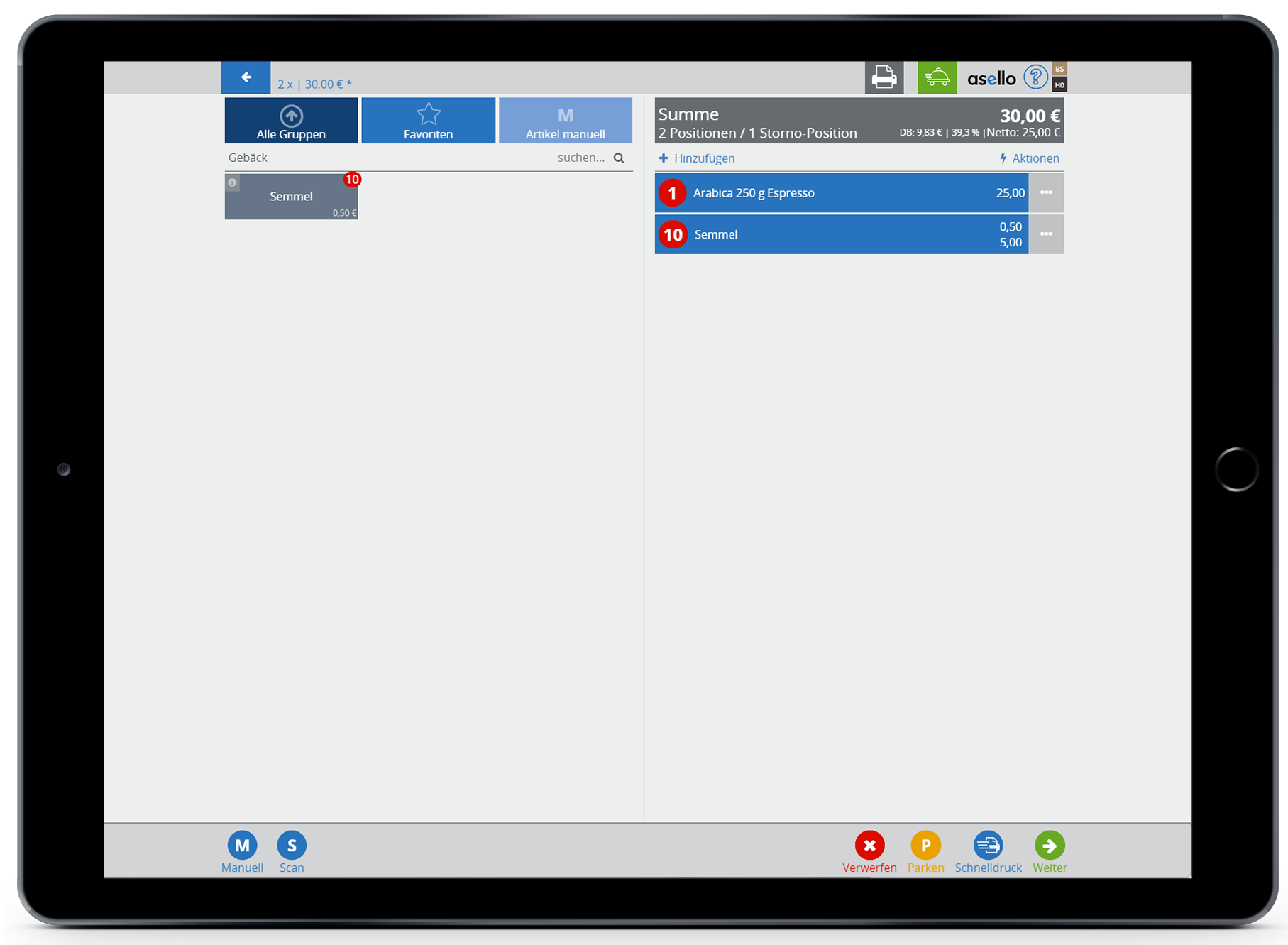 Um einen in der asello Kasse angelegten Gutschein einzulösen, klicken Sie auf „Neu“, um eine neue Rechnung anzulegen. Wählen Sie ein beliebiges Produkt aus und klicken Sie auf den Button "Weiter" in der rechten unteren Ecke.