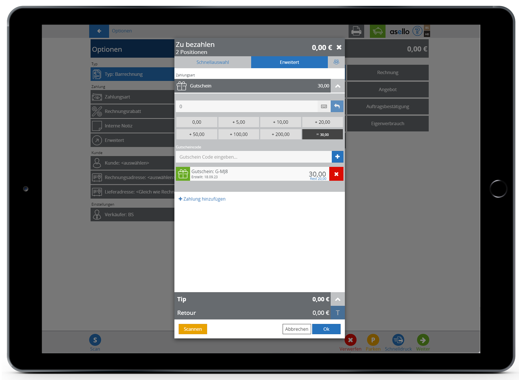 Wenn Sie Ihre Gutscheine als Etikett oder Karte ausdrucken, können Sie den Gutschein-Barcode über den orangefarbenen Button „Scan“ in der linken unteren Ecke einscannen und der Gutschein wird automatisch erfasst.
