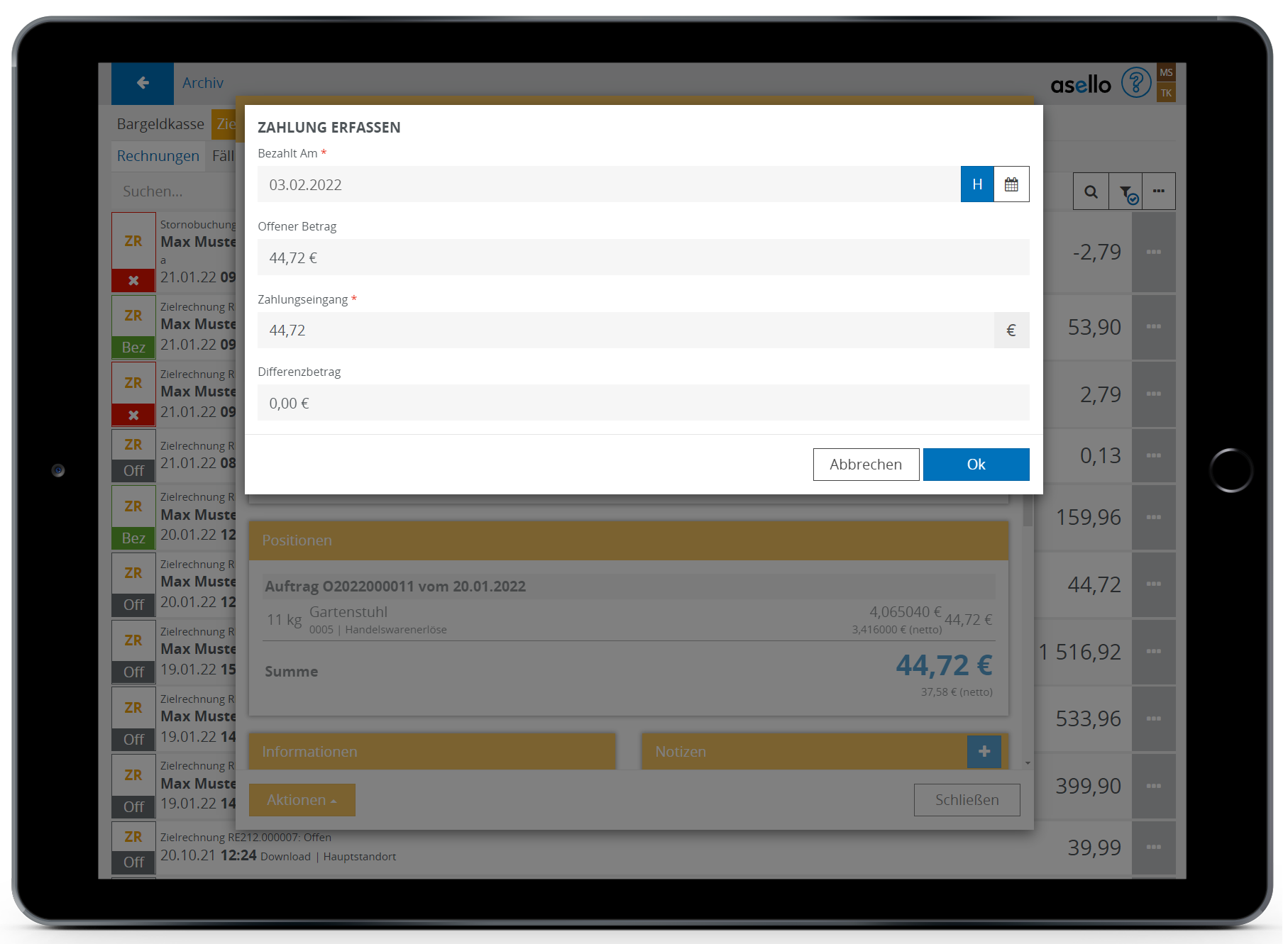 Es öffnet sich ein Pop-Up. Geben Sie das Zahlungsdatum und den Zahlungsbetrag ein. Es wird automatisch der offene Betrag und der Differenzbetrag berrechnet. Anschließend bestätigen Sie mit "OK".