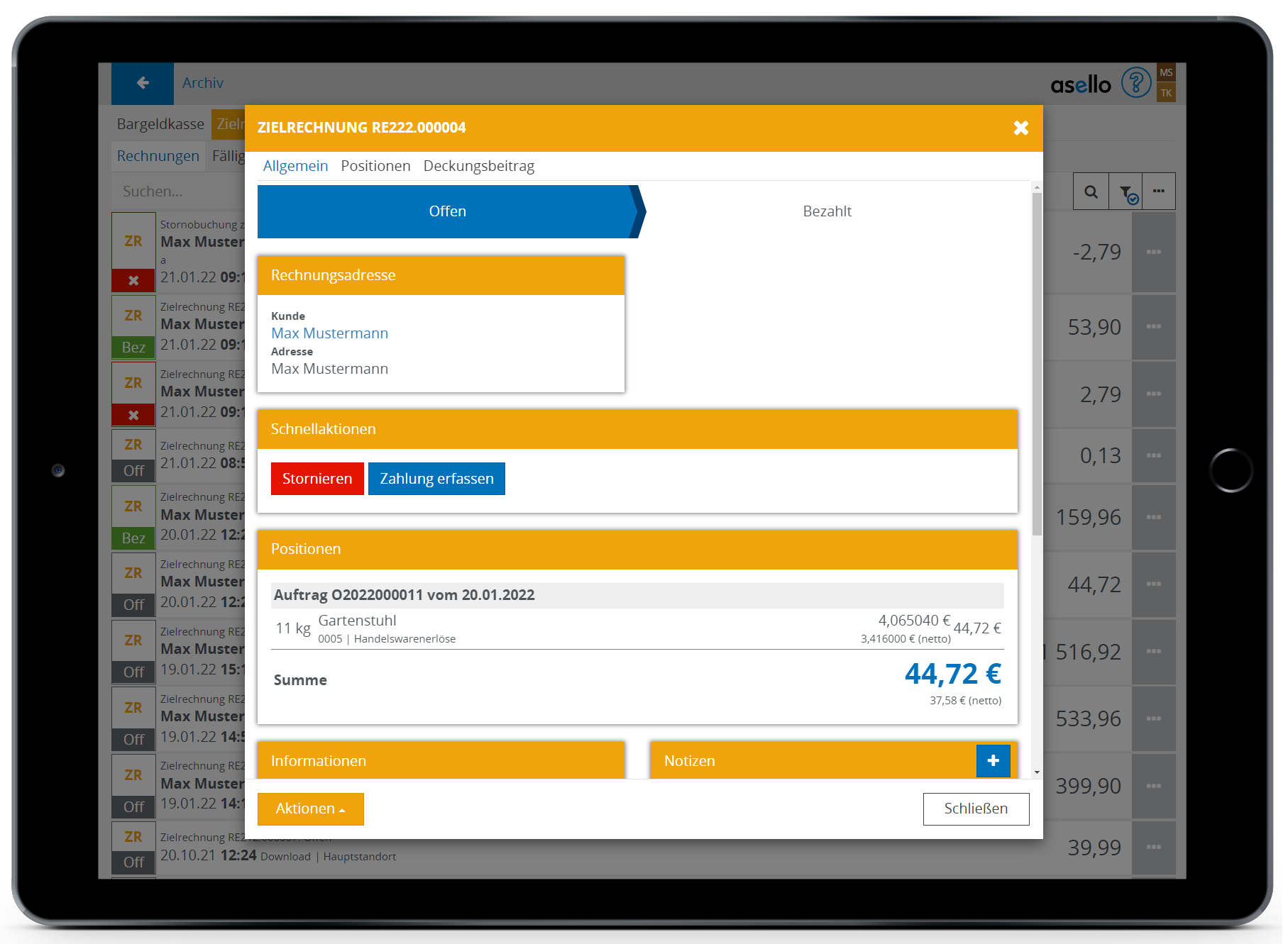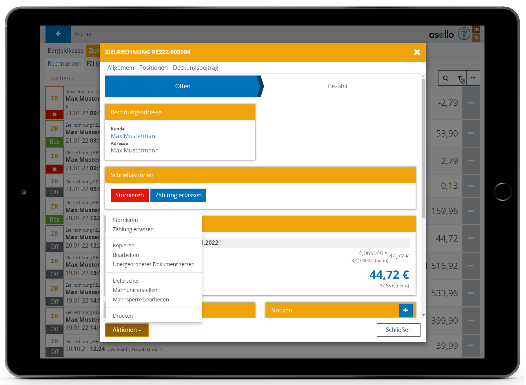 Klicken Sie rechts unten auf "Aktionen" und wählen Sie dort den Punkt "Zahlung erfassen" aus.