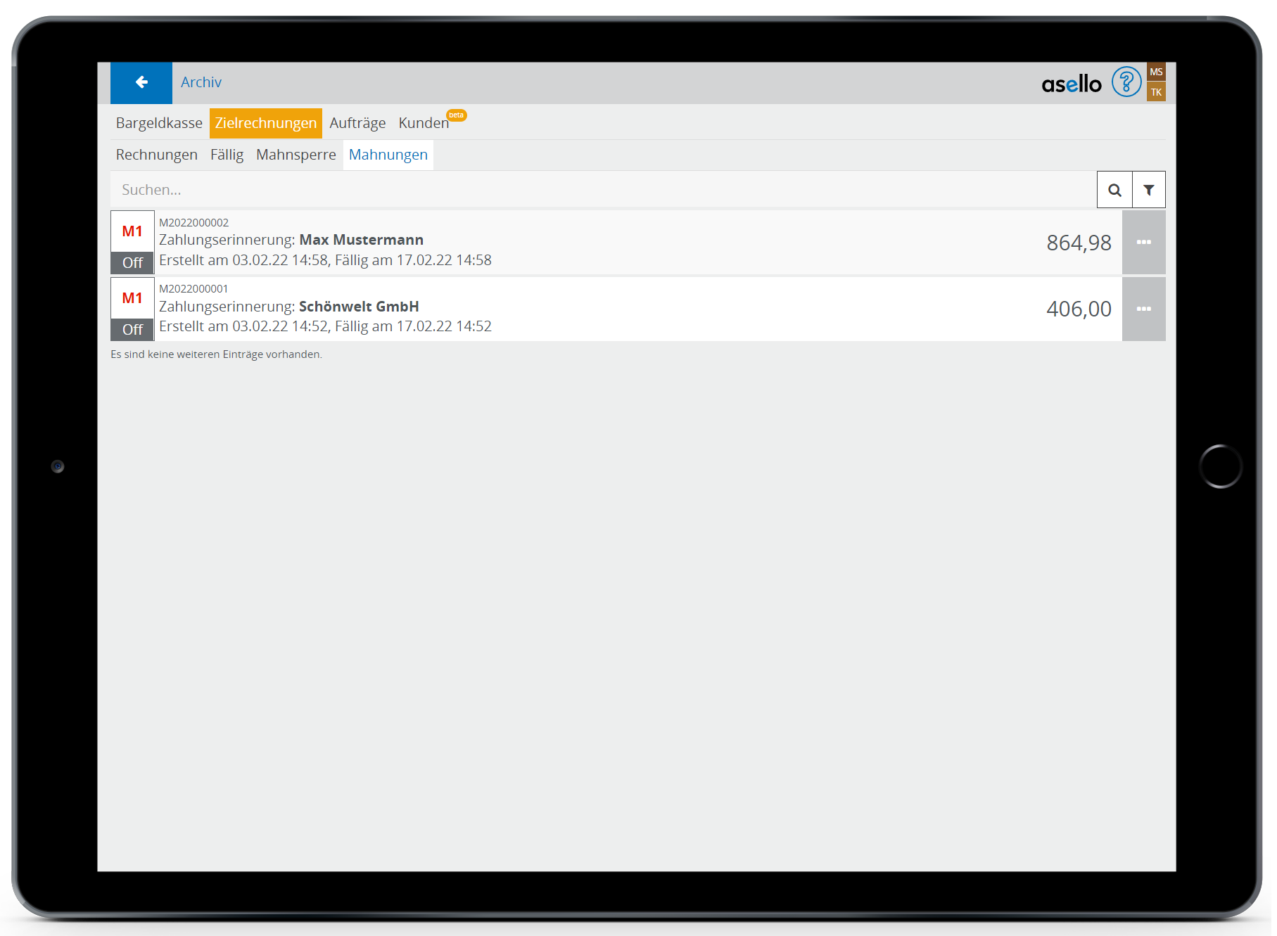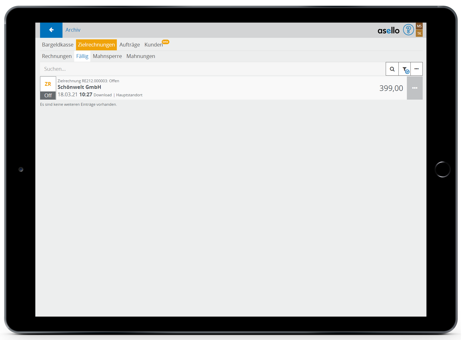 Beim Erstellen der Rechnung muss ein Fälligkeitsdatum gesetzt werden, sodass die Rechnung nach dessen Ablauf hier aufscheint.