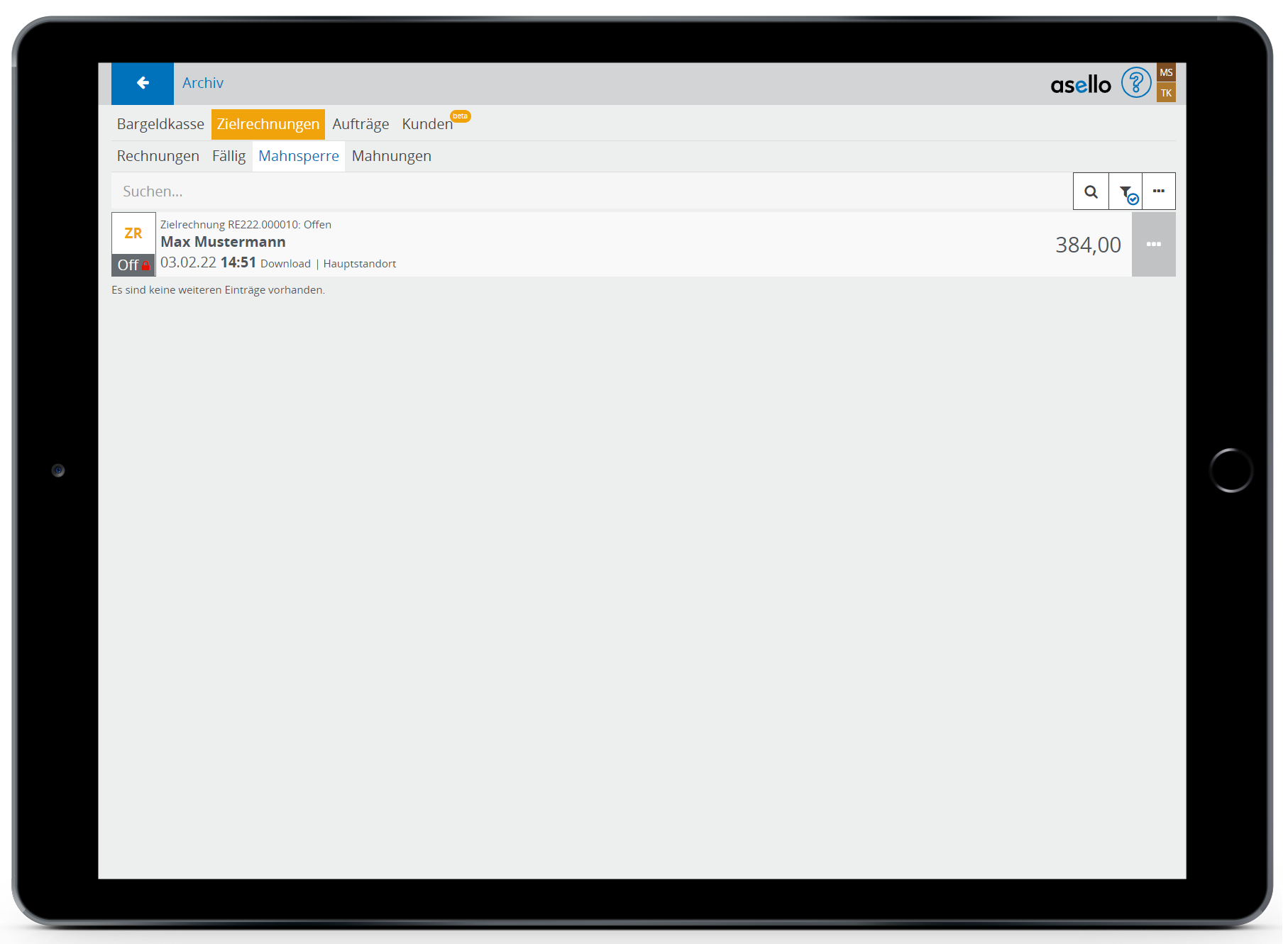 Bei Zielrechnungen kann die Mahnsperre aktiviert werden. Hat die Rechnung das Fälligkeitsdatum bereits erreicht, erscheint diese dann nicht unter "Fällig". Alle Zielrechnungen mit Mahnsperre werden im Reiter Mahnsperre angezeigt (egal ob diese Fällig sind oder nicht).