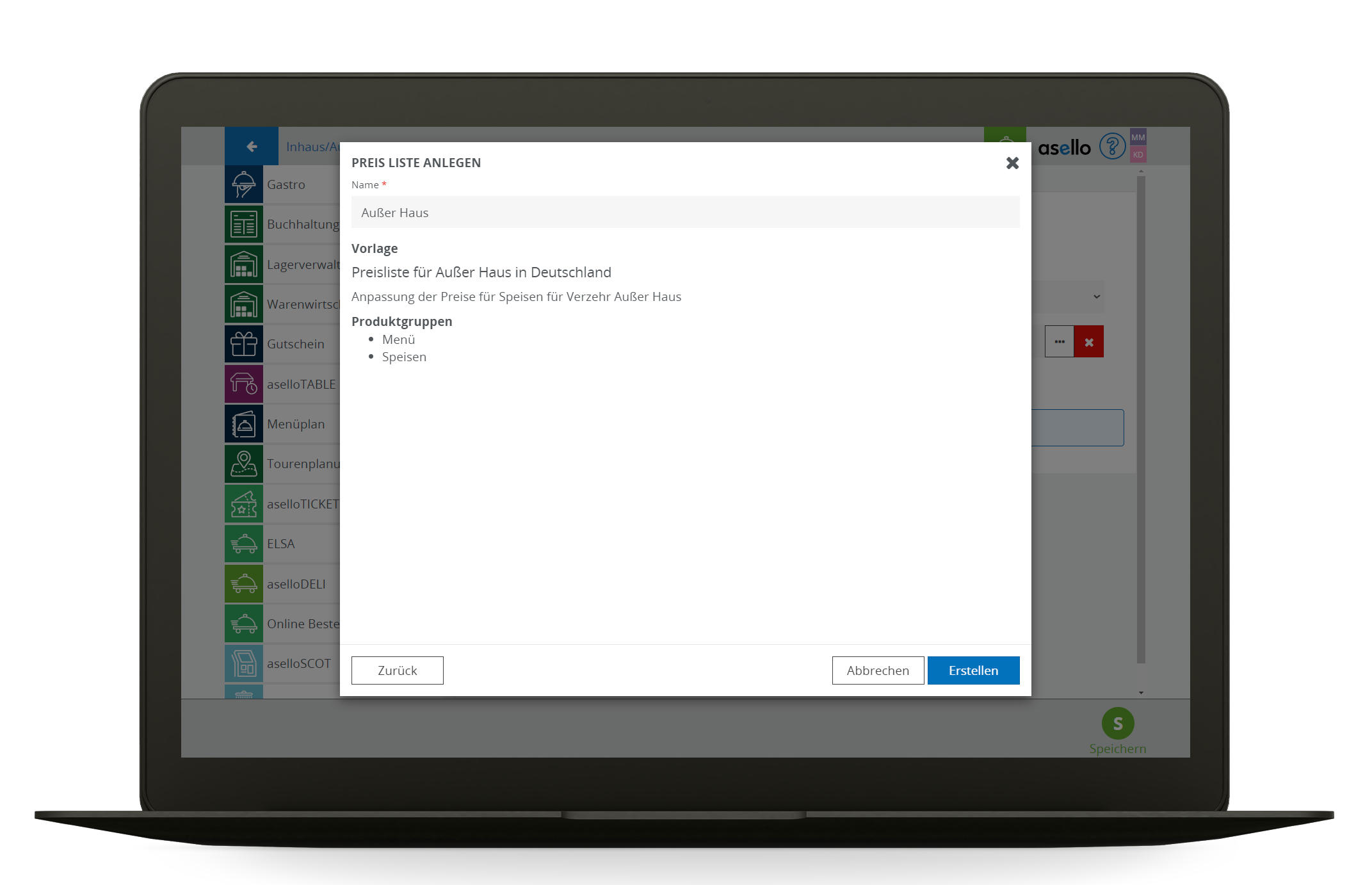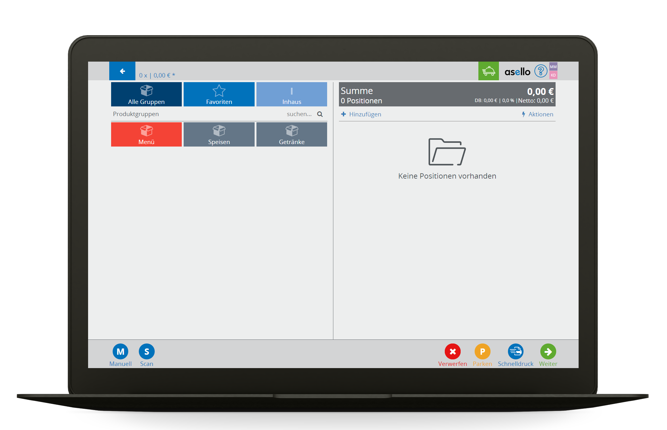 In asello kann eine Konfiguration von Inhaus und Außer Haus Steuersätzen pro Produktgruppe oder pro Produkt erfolgen.