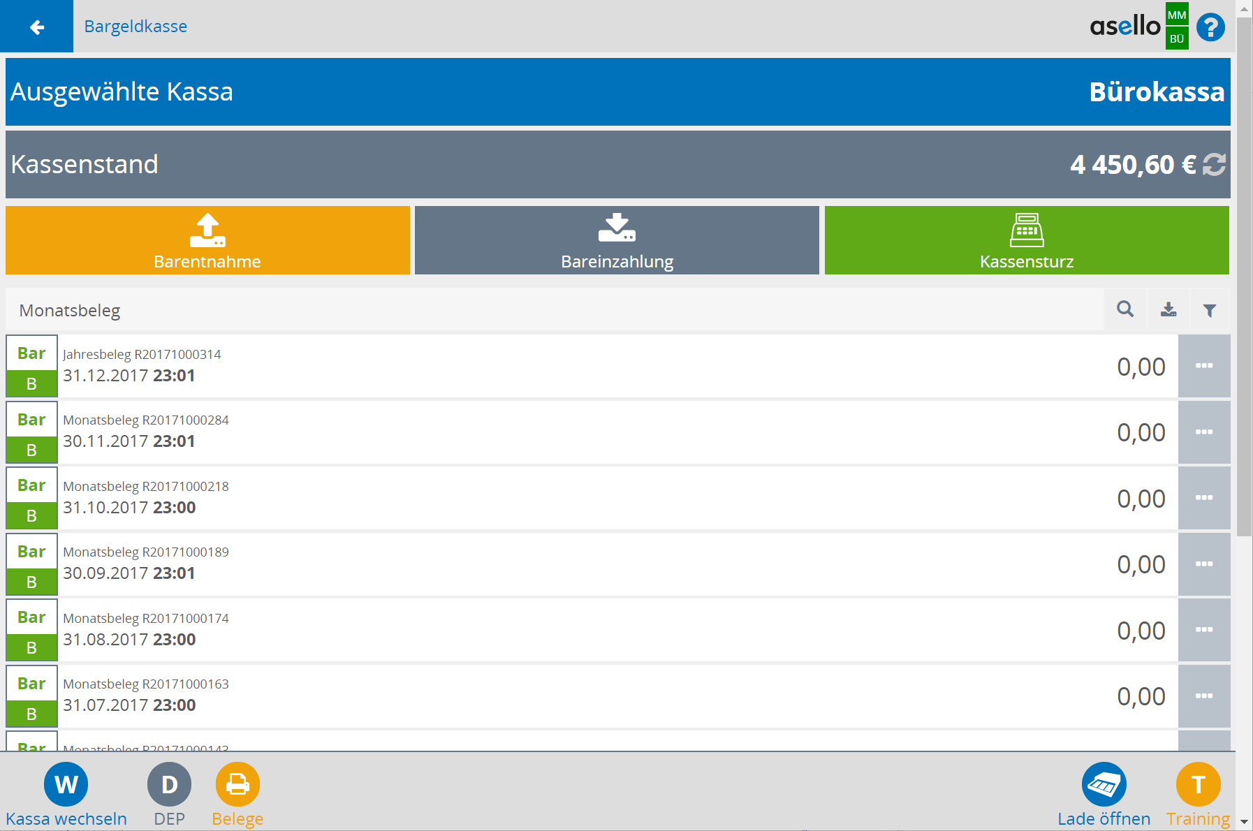 Am Ende des Jahres müssen zwei Schritte durchgeführt werden. Im ersten Schritt muss ein Jahresbeleg erstellt werden. Der Jahresbeleg ist der Monatsbeleg für den Monat Dezember. Wie jeder andere Monatsbeleg ist auch der Jahresbeleg ein Nullbeleg (Barrechnung mit Summe 0,00€). In asello wird der Monatsbeleg automatisch am Ende des letzten Tages des Monats erstellt.