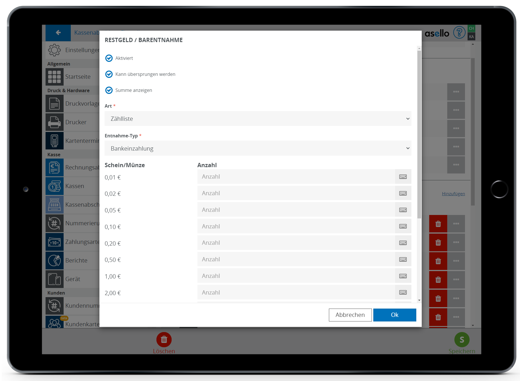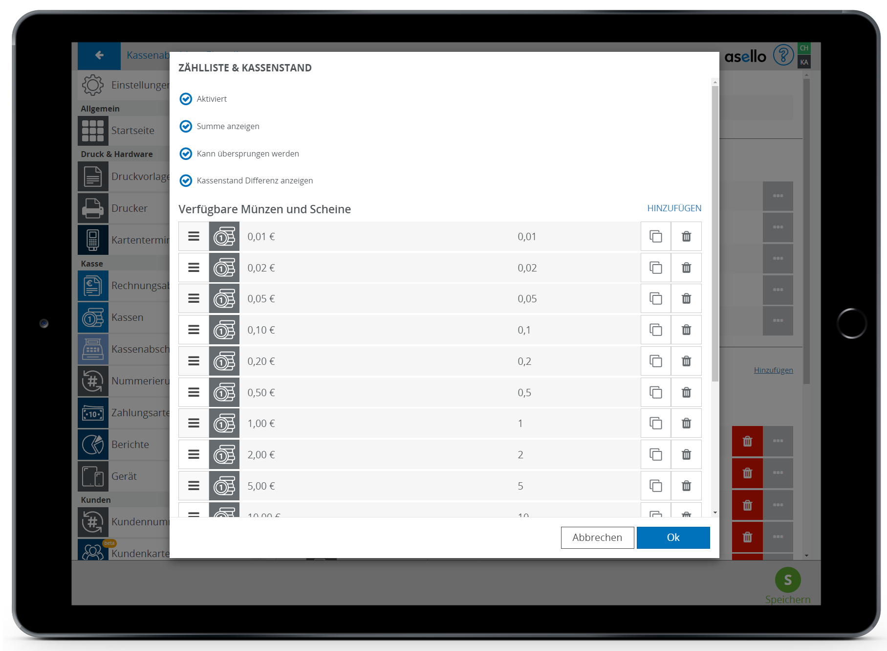 Die Zählliste können Sie unterhalb einstellen. Dadurch können Sie festlegen, welche Münzen und Geldscheine gezählt werden müssen. Um eine Zeile zu löschen, klicken Sie auf das Löschsymbol am Ende der jeweiligen Zeile.