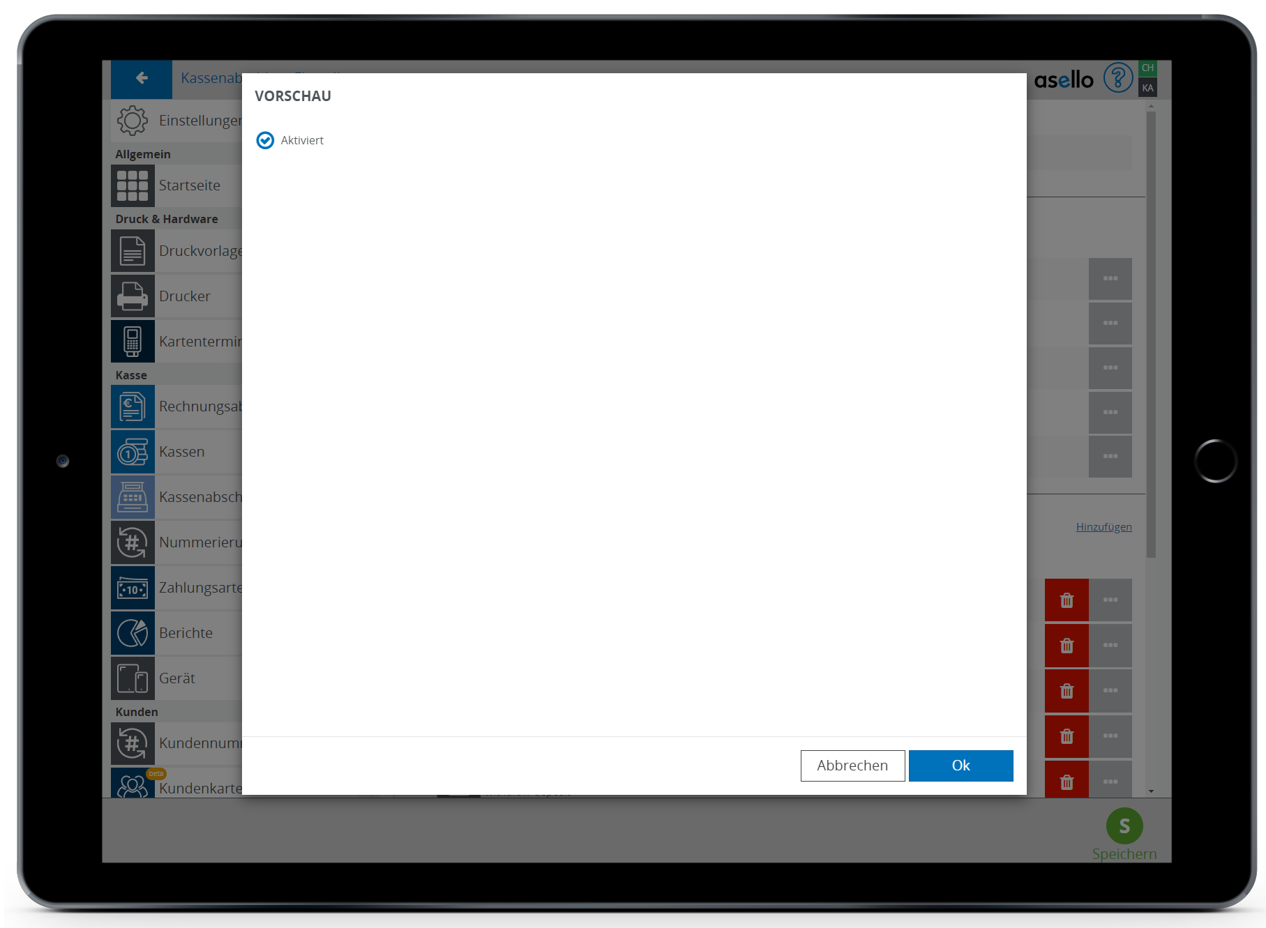 Unter Vorschau können Sie aktivieren, dass zu Beginn eine Vorschau des zu erstellenden Kassenabschlusses angezeigt wird. Um die Vorschau zu aktivieren, klicken auf Sie das graue Kästchen mit den drei weißen Punkten am Ende der Zeile. Nun erscheint ein Pop-Up-Fenster. In diesem setzten Sie bei „aktiviert" ein grünes Häkchen. Soll die Vorschau deaktiviert werde, so entfernen Sie das grüne Häkchen. Abschließend klicken Sie auf den blauen Button „OK".