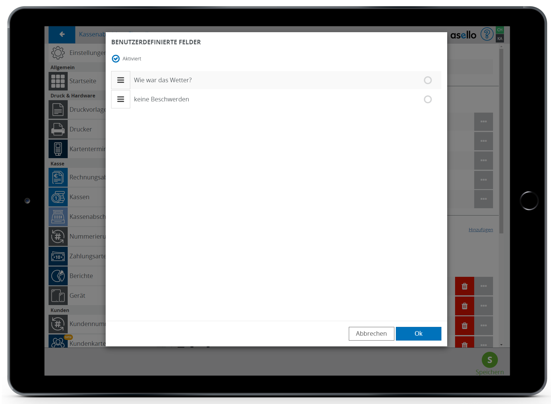 Um die Abfrage von benutzerdefinierten Feldern zu aktivieren, klicken auf Sie das graue Kästchen mit den drei weißen Punkten am Ende der Zeile. Nun erscheint ein Pop-Up-Fenster. In diesem setzten Sie bei „aktiviert" ein grünes Häkchen. Soll die Zählliste und der Kassenstand deaktiviert werde, so entfernen Sie das grüne Häkchen.