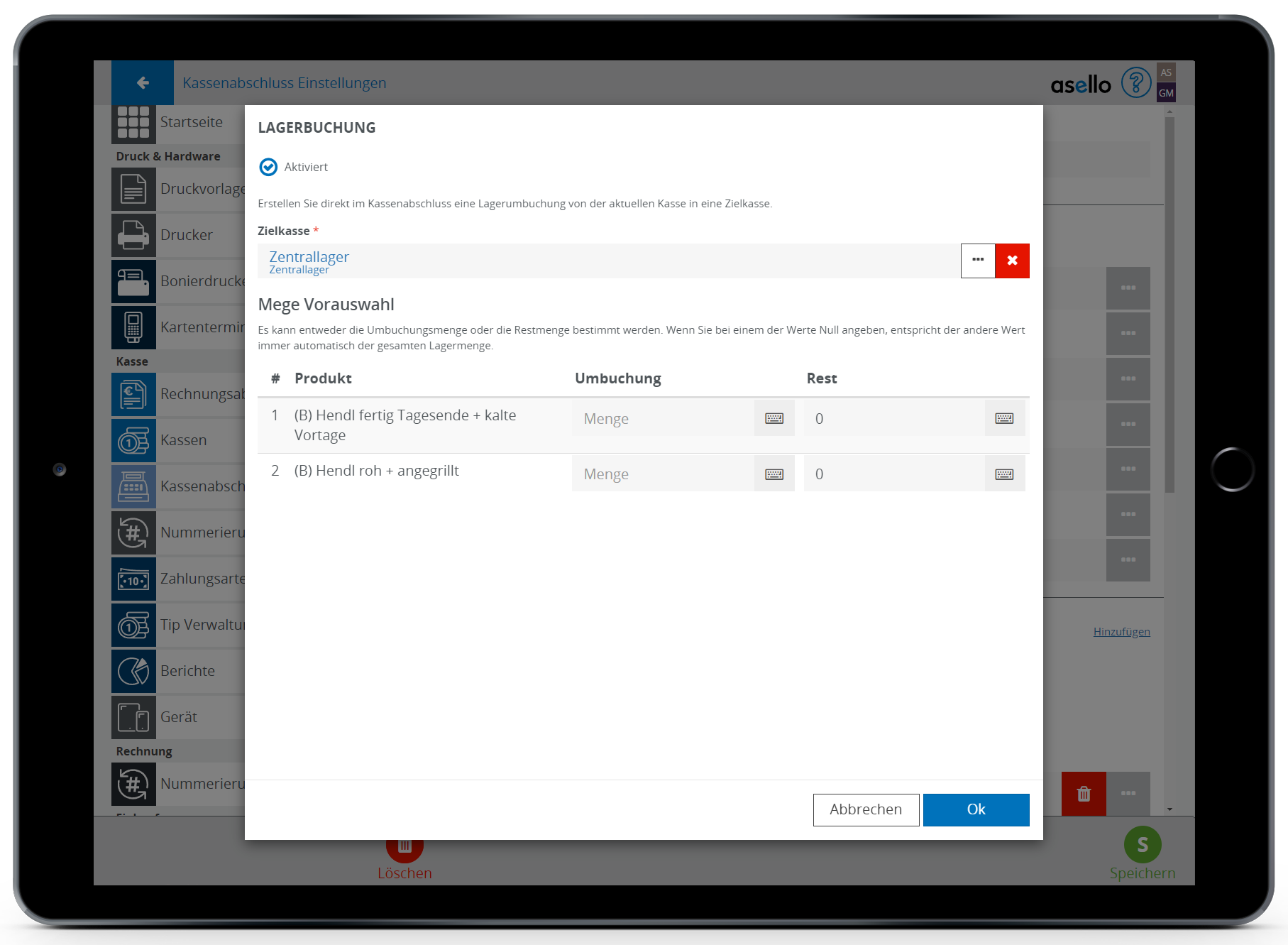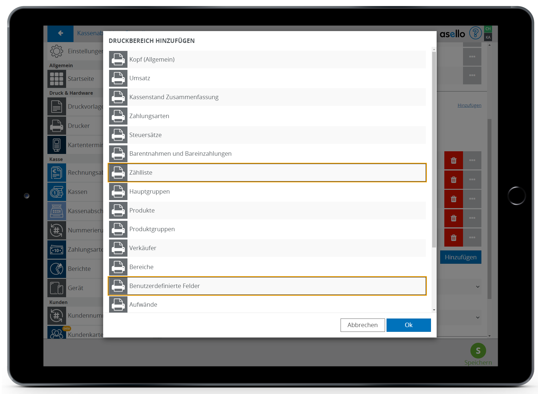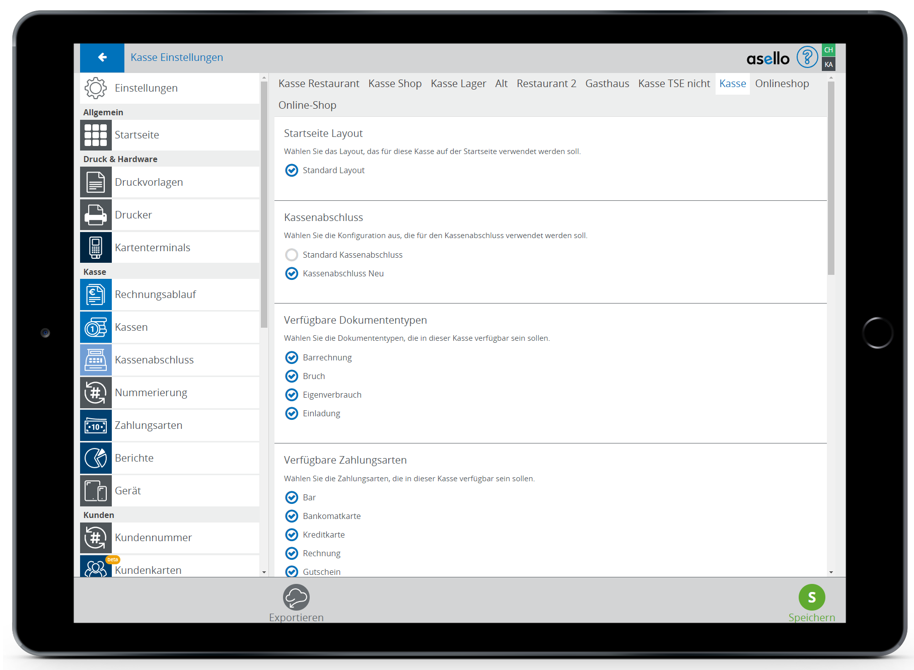 In asello können Sie einen Kassenabschluss einer Kasse zuteilen. Dadurch können Sie mit der Kasse unterschiedliche Bereiche abdecken. Wenn Sie beispielsweise ein Restaurant mit einem kleinen Shop haben, indem eigene Produkte verkauft werden.