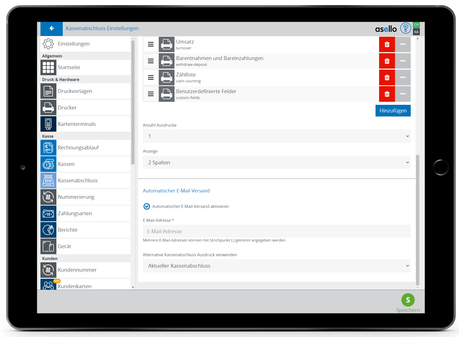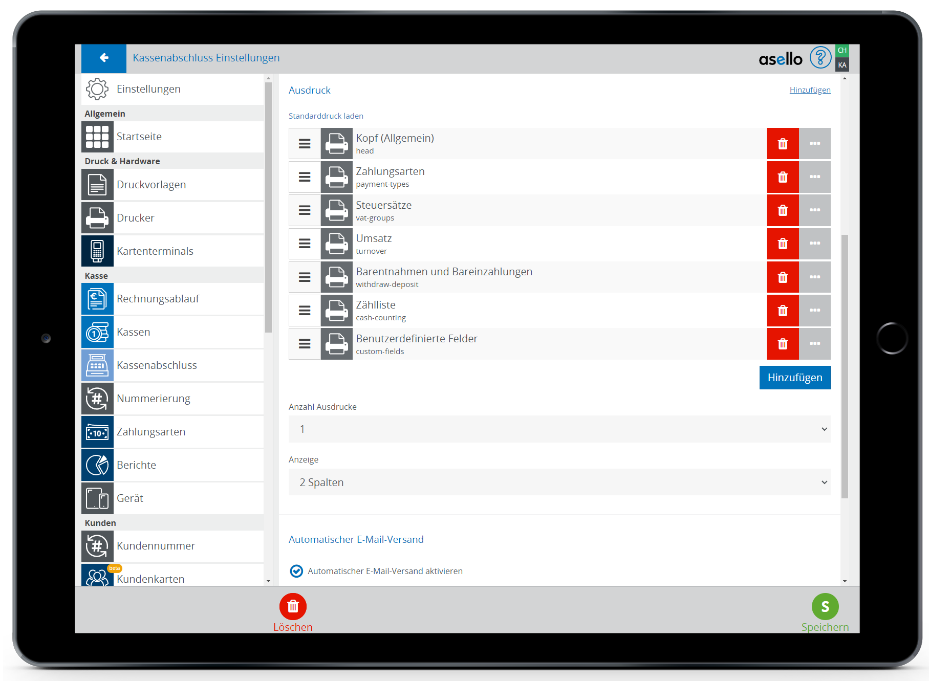 Unter den Druckbereichen können Sie die Anzahl der Ausdrucke festlegen und unter "Anzeige" auswählen, ob der Kassenabschluss in aselloPOS in einer oder zwei Spalten angezeigt wird.