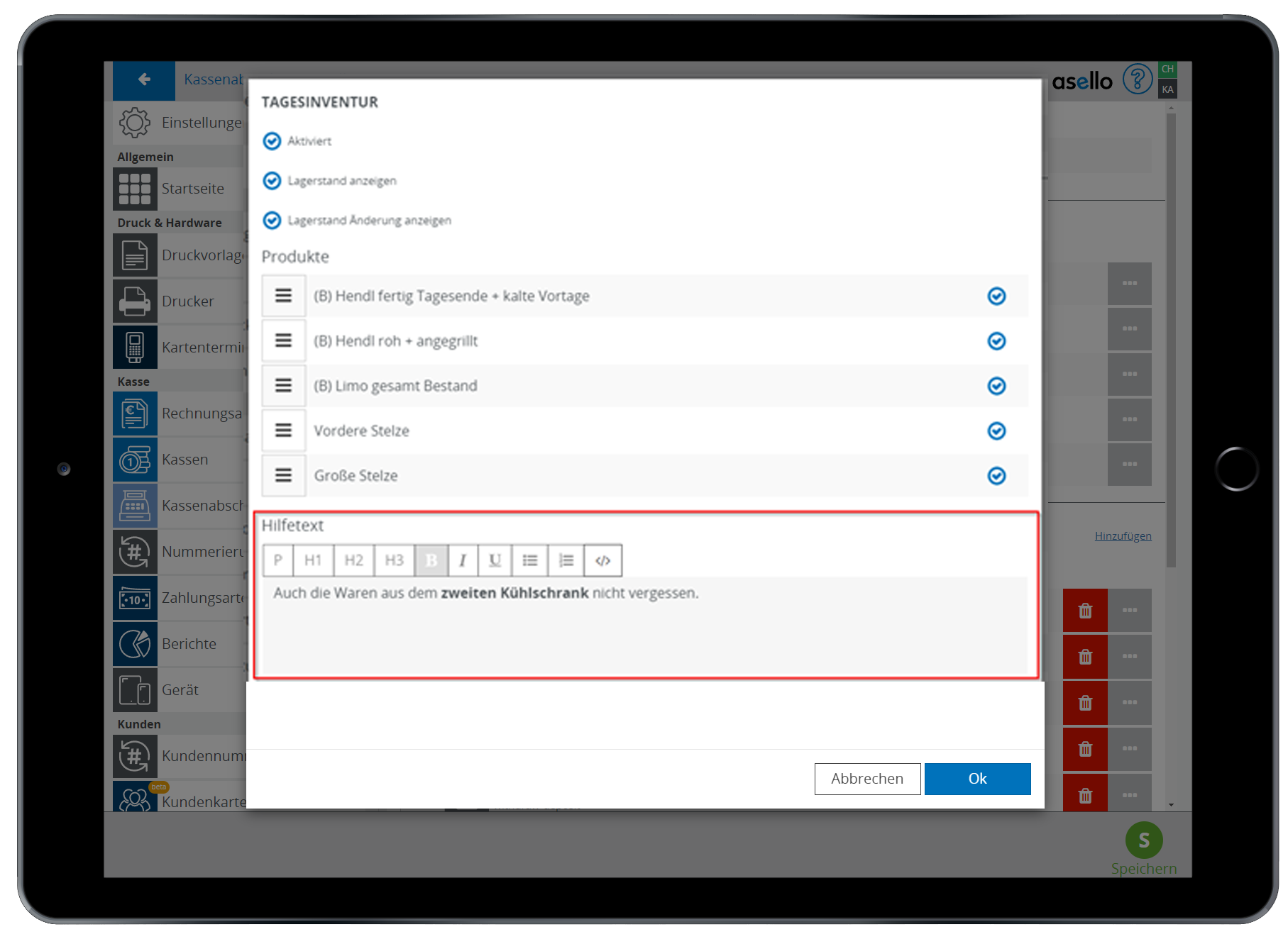 Um einen Hilfetext für einen Schritt zu definieren muss unter „Ablauf“ auf den jeweiligen Schritt geklickt werden. Ganz unten ist nun ein Textfeld, bei dem der Hilfetext angegeben und formatiert werden kann. Beim durchführen des Kassenabschlusses wird dieser nun oben angezeigt.