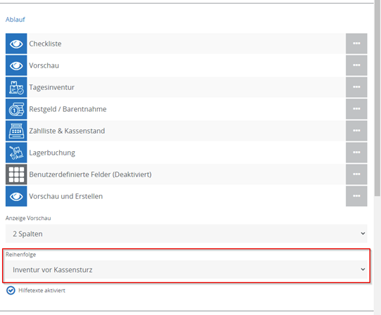 Im Abschnitt „Ablauf" können Sie einzelne Schritte aktivieren, die beim Erstellen des Kassenabschlusses durchgeführt werden müssen. Die Reihenfolge dieser Schritte kann nicht geändert werden.
