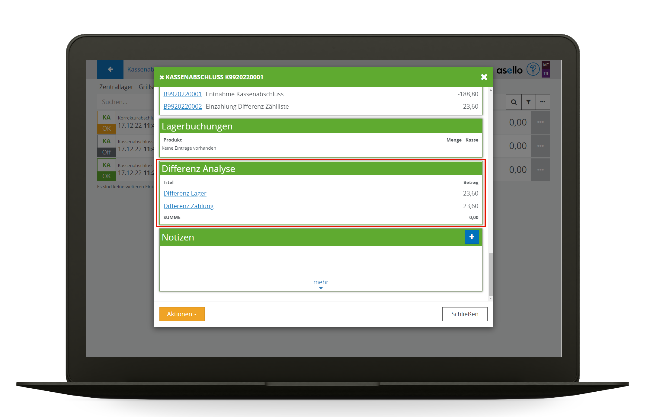 Im Element Differenzanalyse wird als Übersicht eine Differenz des Lagers und eine Differenz des Bargeldes angezeigt.