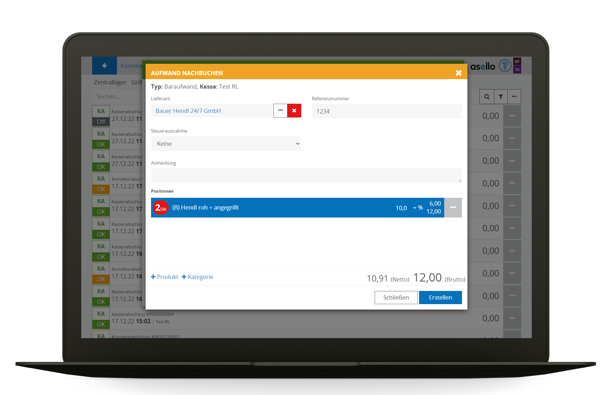 Sollten Aufwände, die mit Bargeld bezahlt wurden, vergessen wurden einzubuchen, können diese im Kassenabschluss mit Berücksichtigt werden. In diesem Beispiel wurden von einem Lieferanten Hendl geliefert, die vergessen wurden einzubuchen (2x6,00€ = 12,00€).