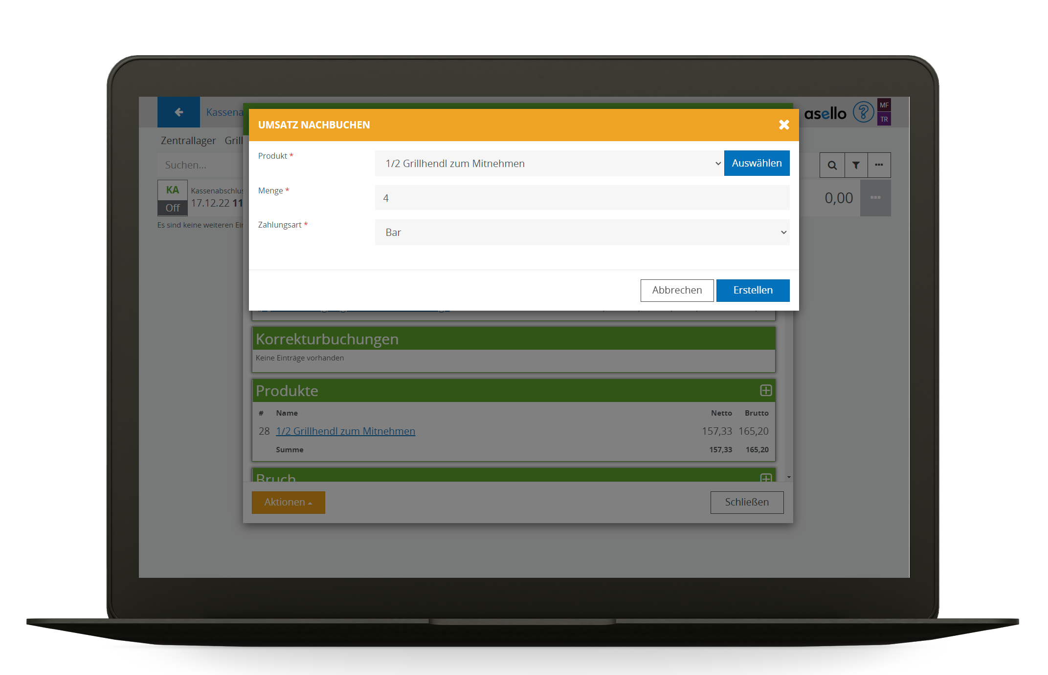 Wurde auf das Buchen eines Verkaufes vergessen, kann dieser bei den jeweiligen Produkten nachgebucht werden. Als Beispiel wurden 28 halbe Stück verkauft, 2 sind als Bruch ausgebucht worden. Das ergab eine Differenz von 2 Grill Hendl. In der Kasse bei der Zählliste wurden 23,60 € mehr in der Kasse gezählt, als da sein hätten müssen. Damit ergibt somit eine fehlende Eingabe von 4x 1/2 Grill Hendl als Verkauf mit der Zahlungsart Bar.