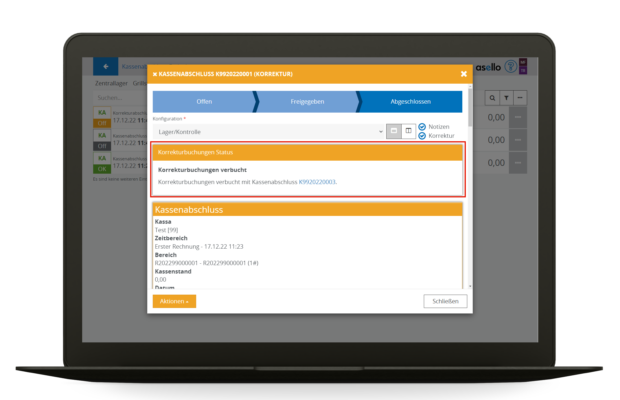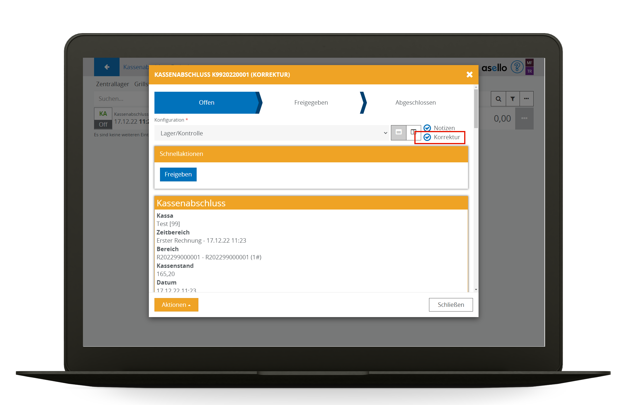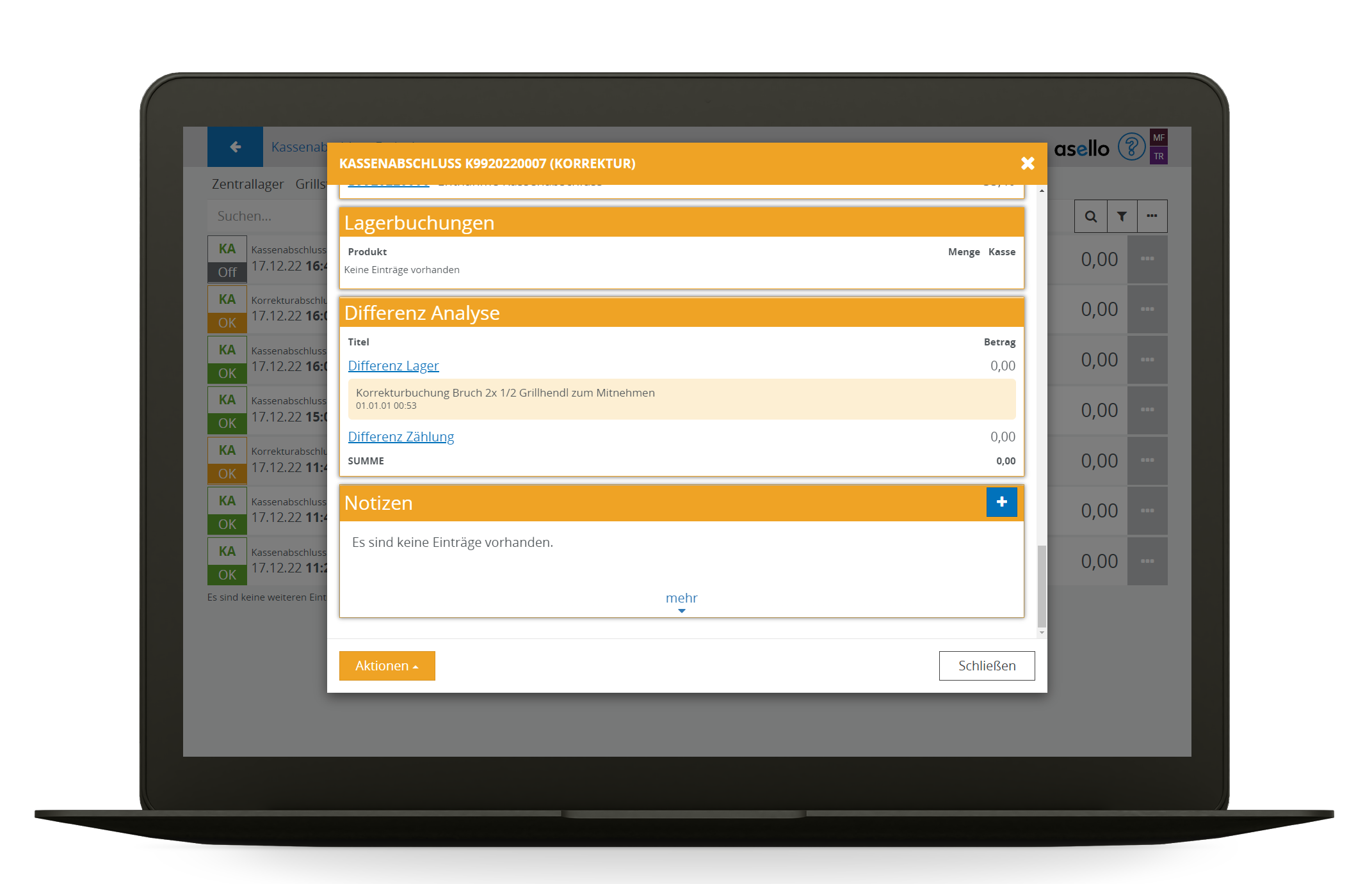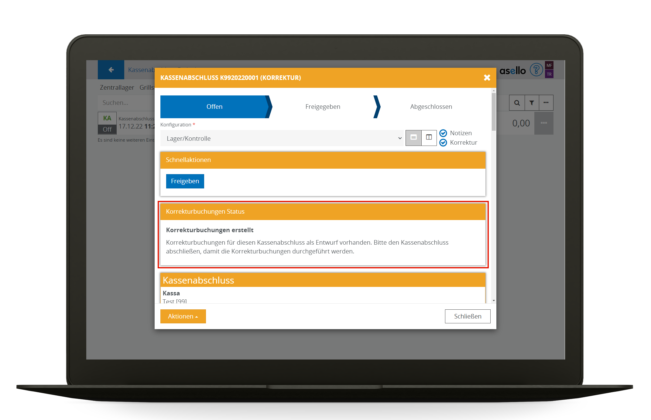 Um diesen Ablauf im Geschäftsbetrieb zu unterstützen, werden von asello Kassenabschluss korrekturen Unterstützt, die nach dem nächsten Kassenabschluss nachgebucht werden.