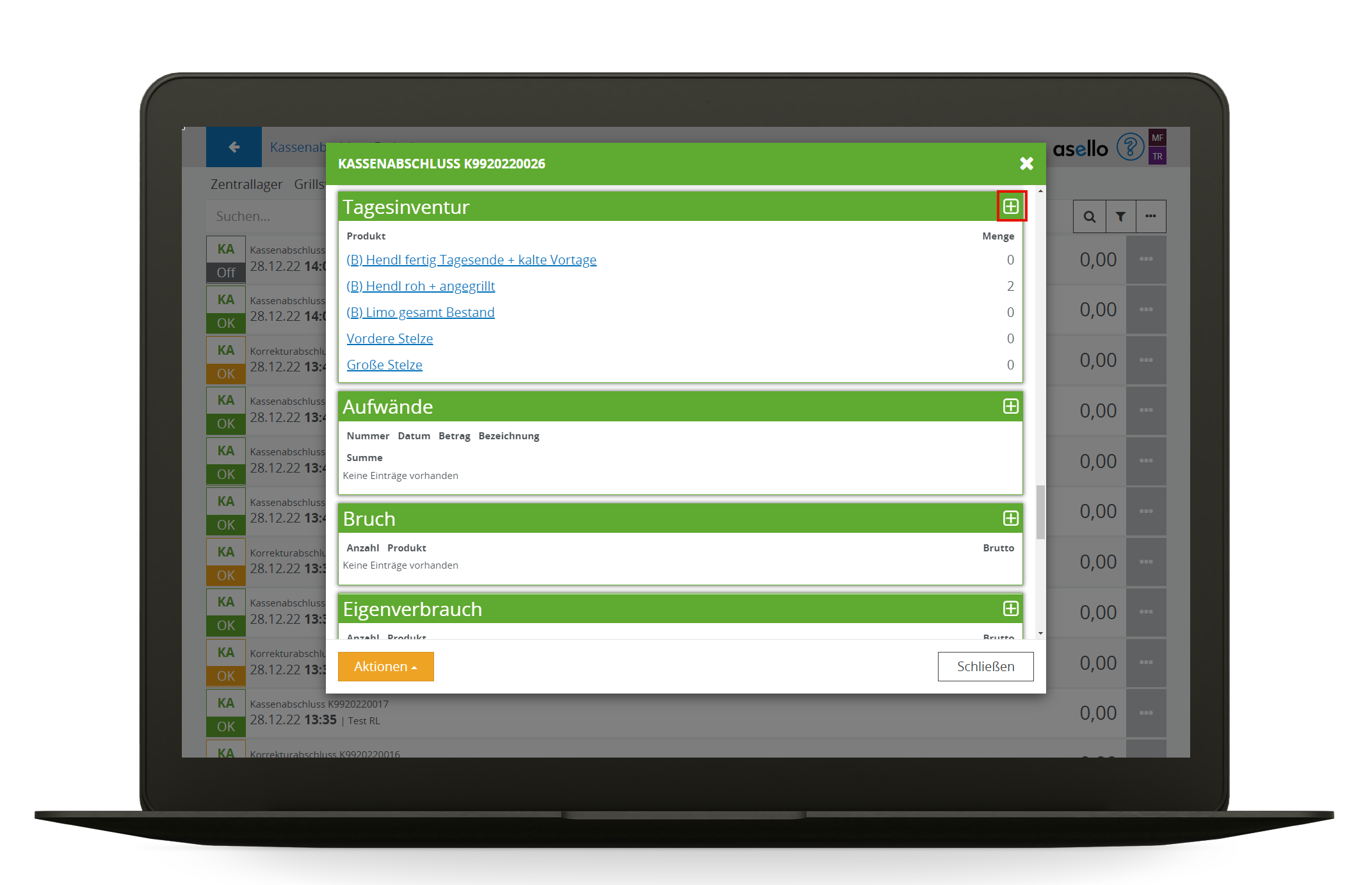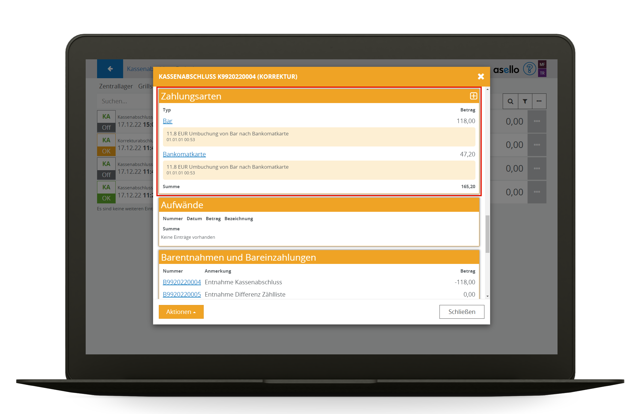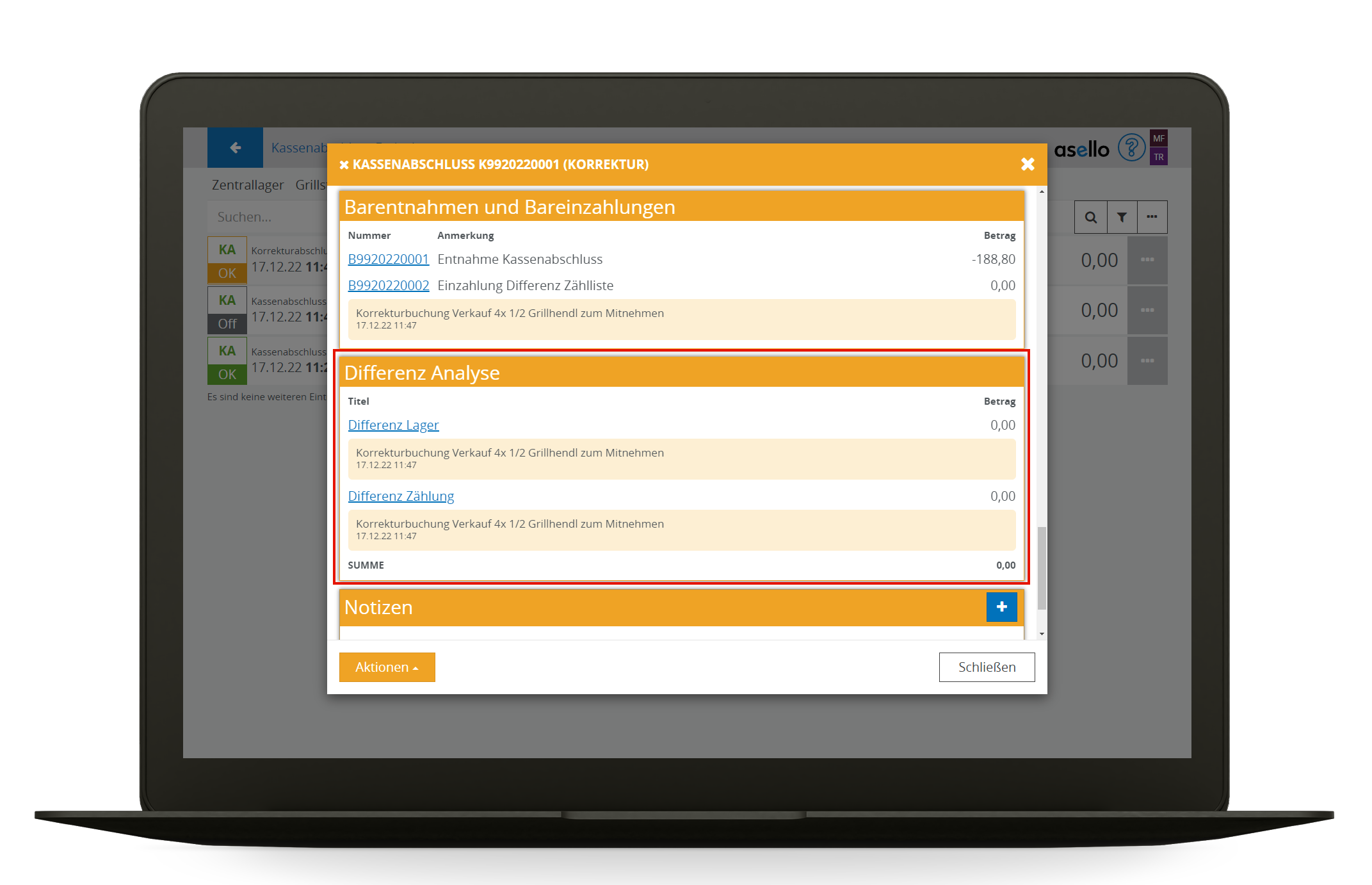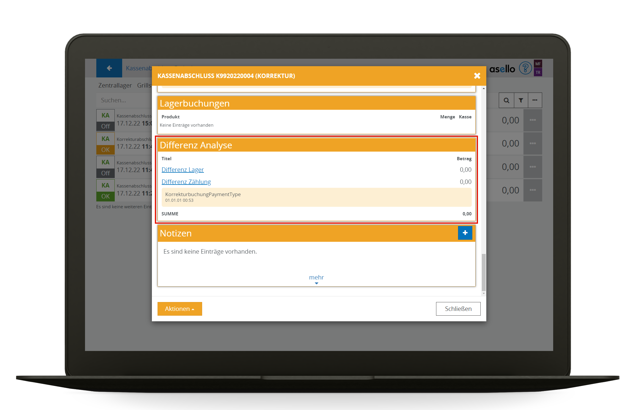 Um diesen Ablauf im Geschäftsbetrieb zu unterstützen, werden von asello Kassenabschluss korrekturen Unterstützt, die nach dem nächsten Kassenabschluss nachgebucht werden.