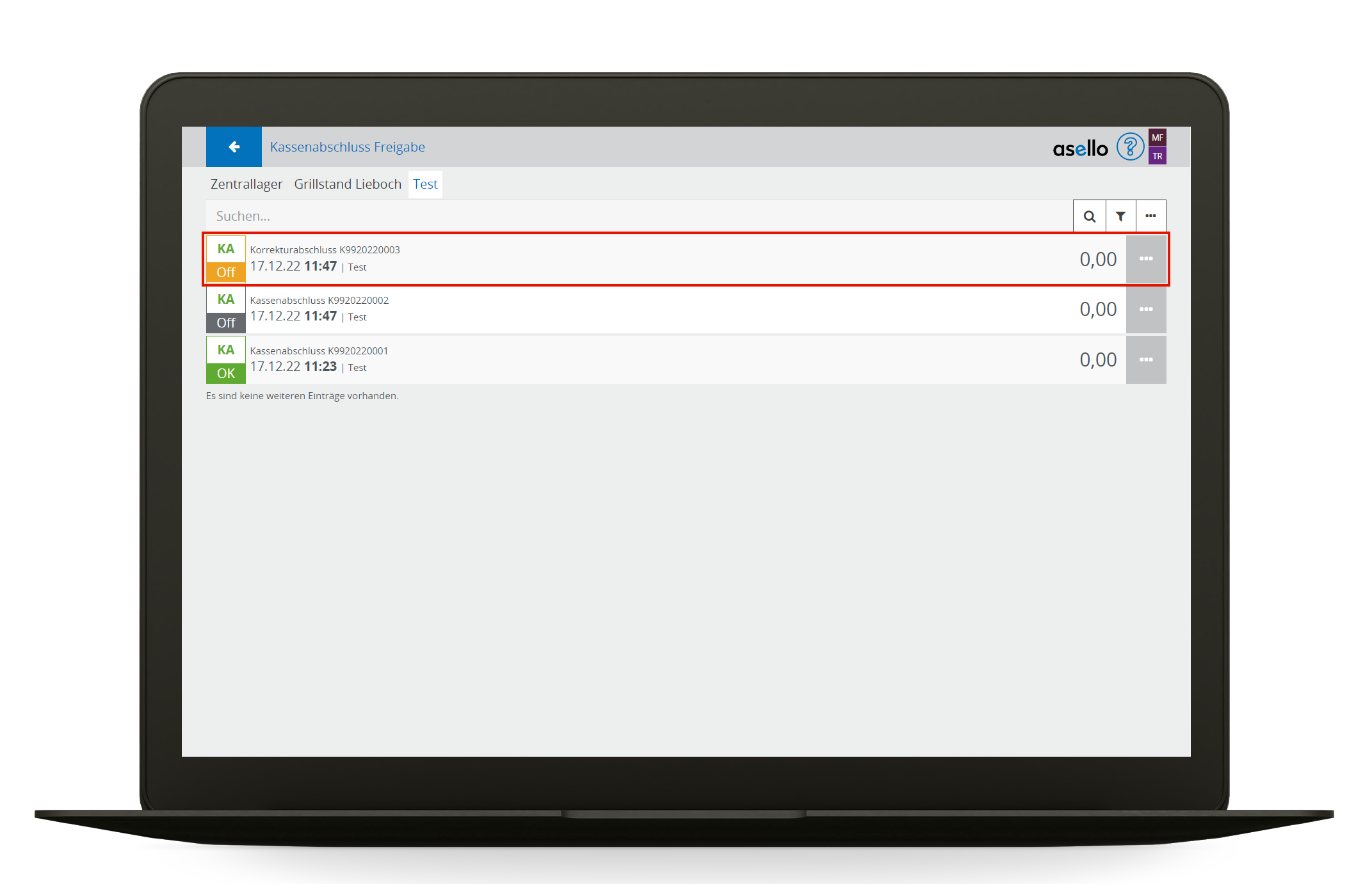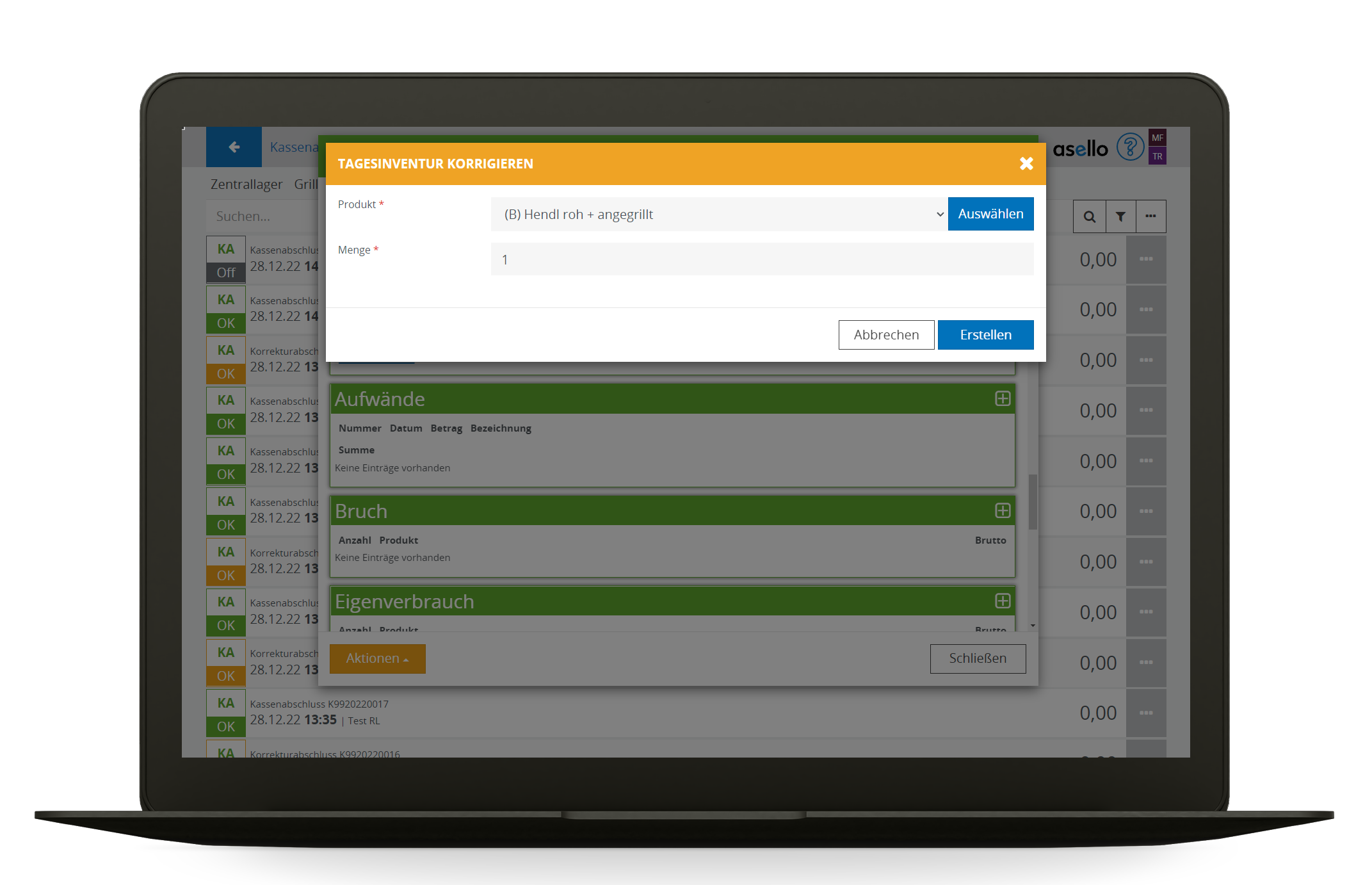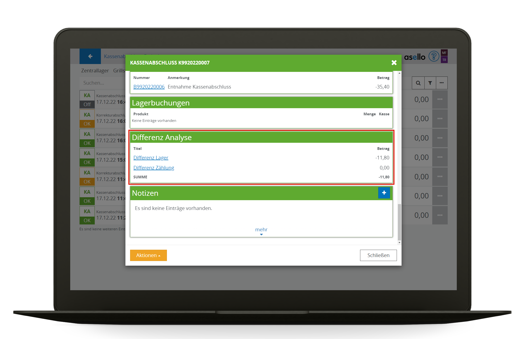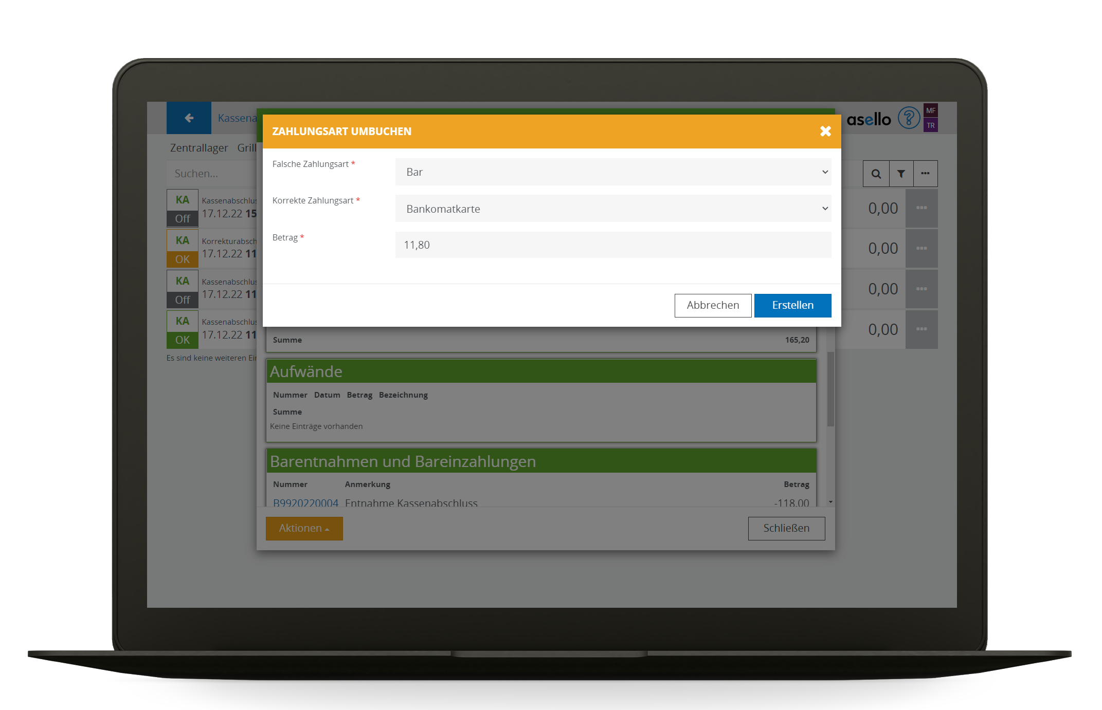 Um diesen Ablauf im Geschäftsbetrieb zu unterstützen, werden von asello Kassenabschluss korrekturen Unterstützt, die nach dem nächsten Kassenabschluss nachgebucht werden.