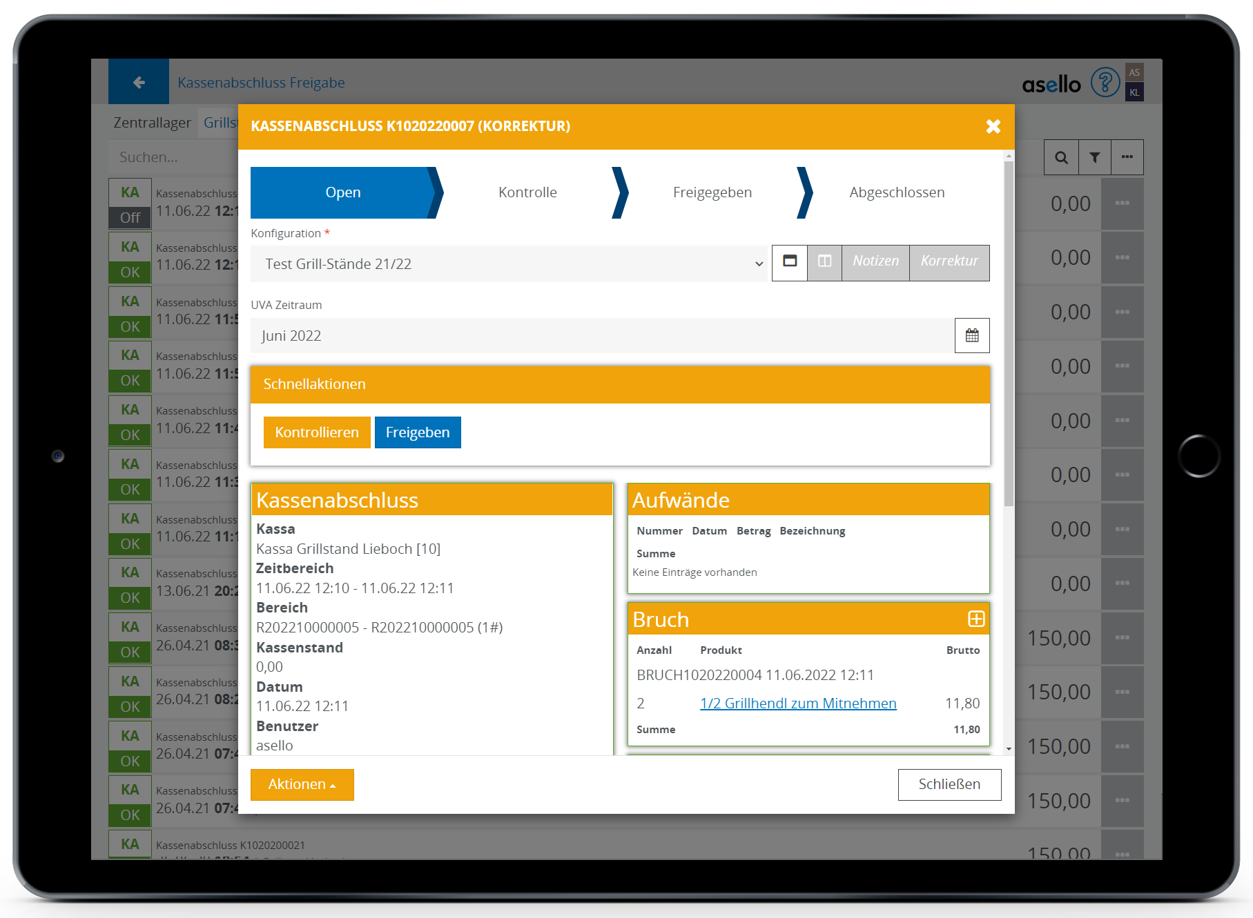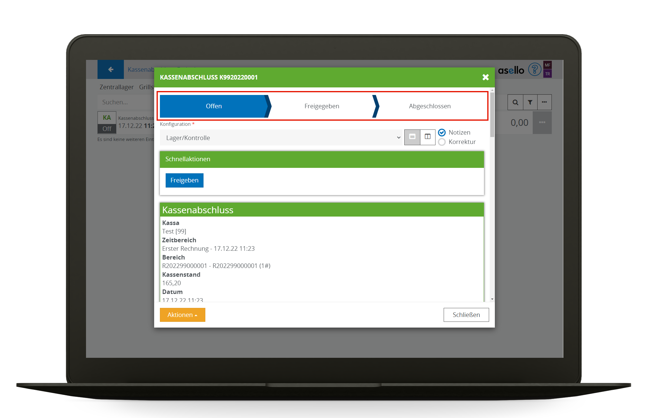 Der aktuelle Status des Kassenabschlusses wird in der Detailansicht ganz oben angezeigt und kann unter „Aktionen“ geändert werden.