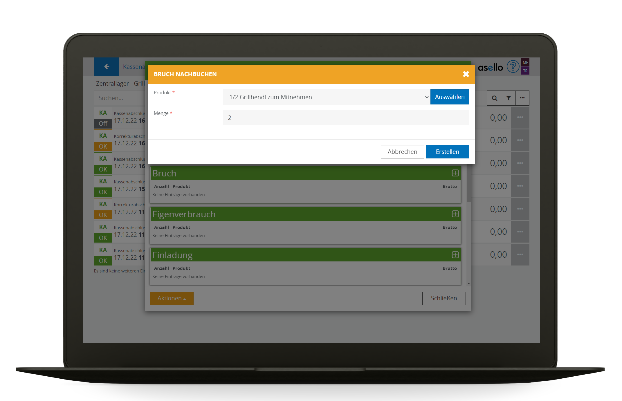 Sollen die Geschäftsfälle Bruch, Eigenverbrauch oder Einladung fehlen, können diese im Kassenabschluss genauso nachgebucht werden. In diesem Beispiel wird nur auf den Geschäftsfall Bruch eingegangen und die Bescreibung ist genauso auch für Eigenverbrauch und Einladung gültig, da diese Buchungen keine Auswirkungen auf die Finanziellen Parameter haben, sondern nur ein Auswirkung auf das Lager haben.