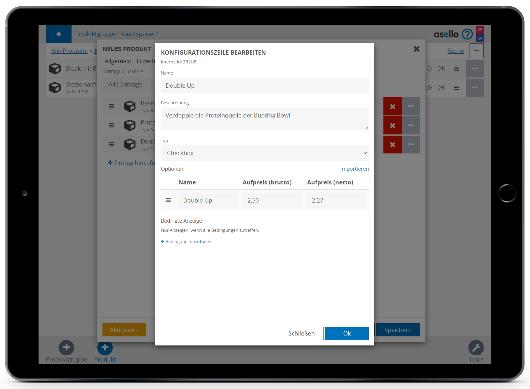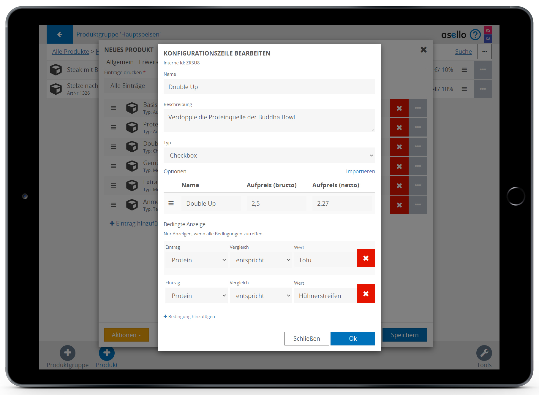 In unserem Beispiel „Buddha Bowl“ wählen wir den Eintrag „Protein“ der dem Wert „Tofu“ oder „Hühnerstreifen“ entspricht. Dadurch wird die Option „Double Up“ nur angezeigt, wenn eine der beiden Optionen im Eintrag „Protein“ ausgewählt wird.