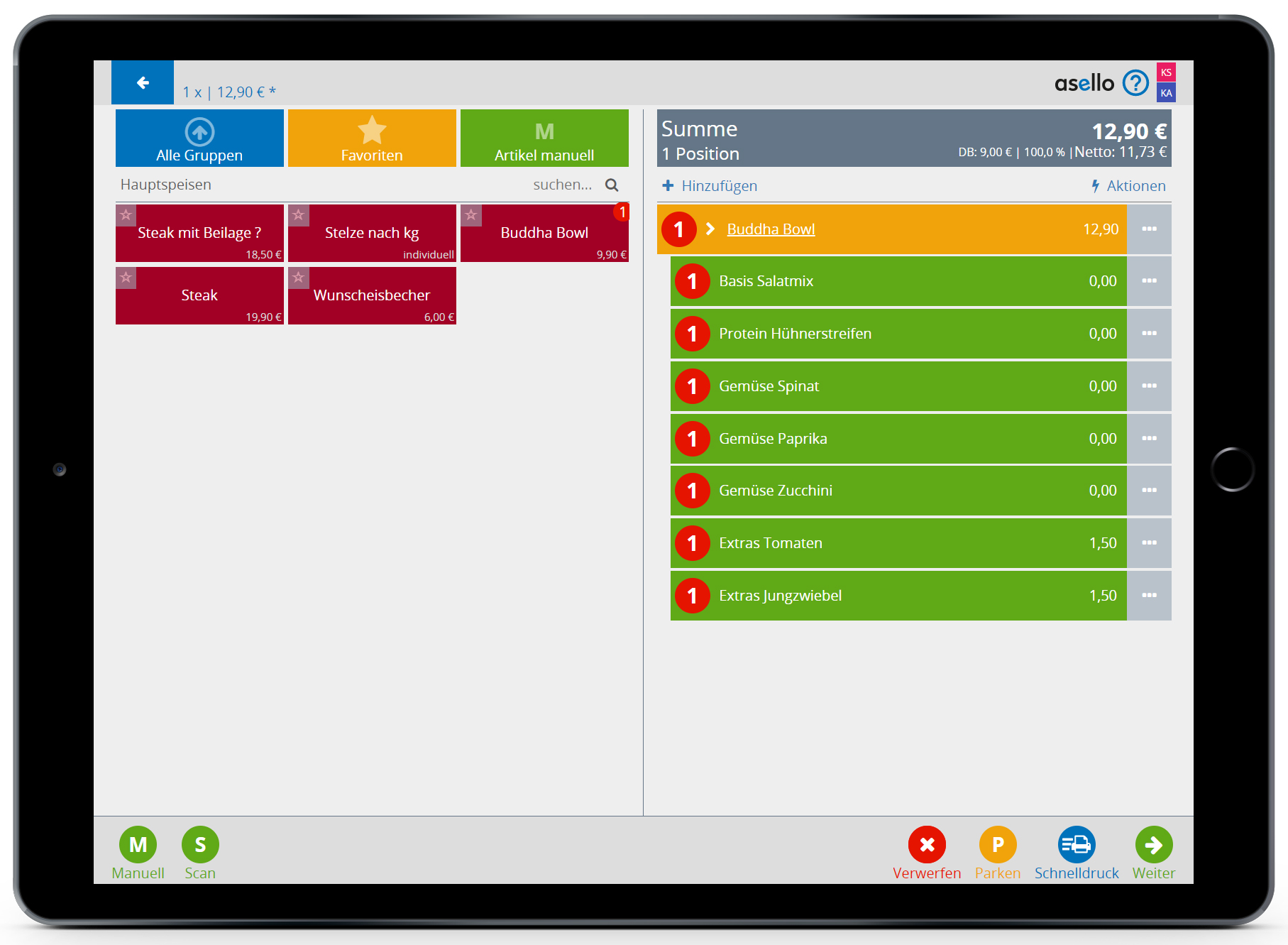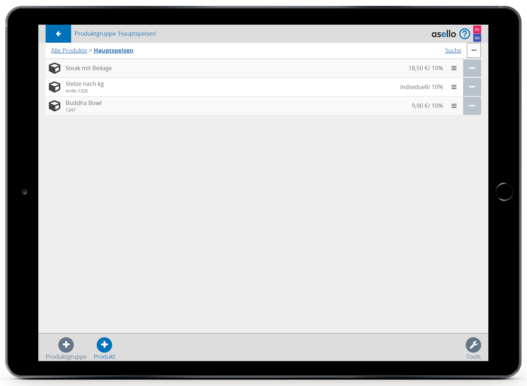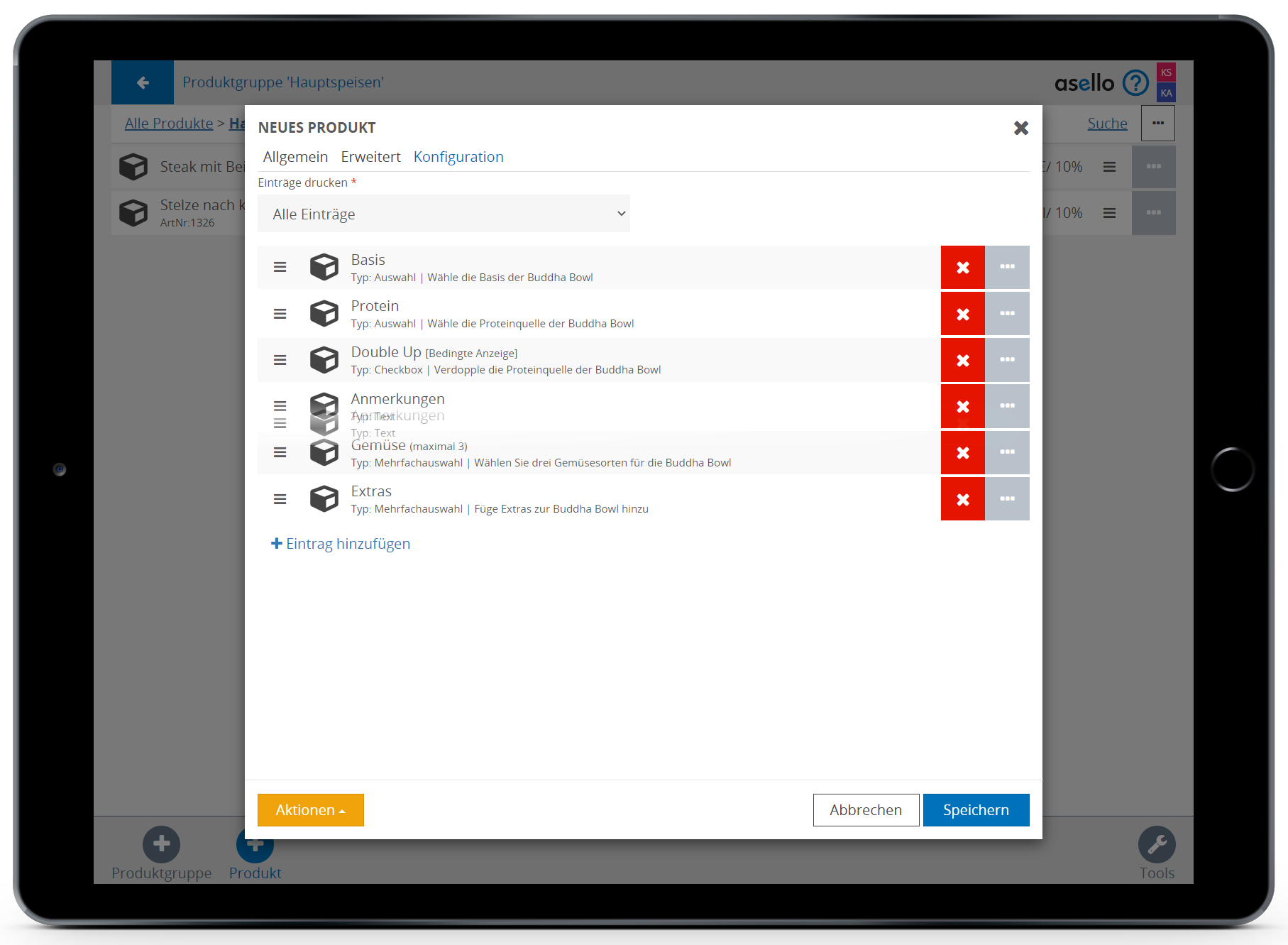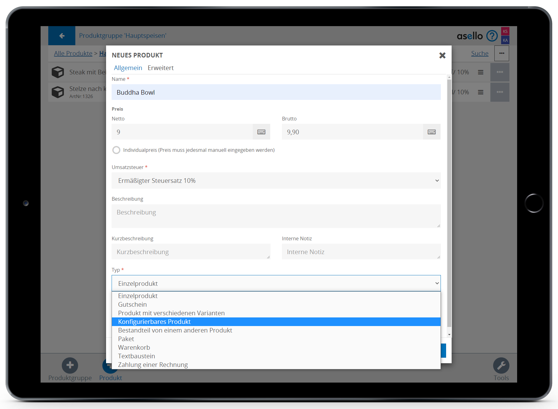 In diesem Beispiel möchten wir das Produkt „Buddha Bowl“ in der Produktgruppe „Hauptspeisen“ erstellen.