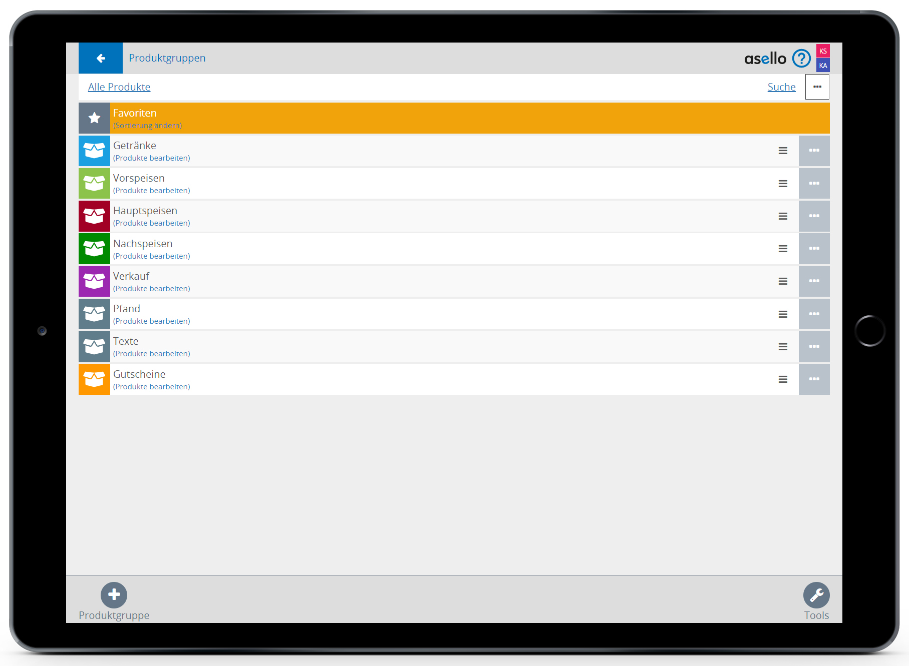 Um ein neues konfigurierbares Produkt zu erstellen klicken Sie auf der asello Startseite auf die graue Kachel Stammdaten und anschließend auf die orange Kachel „Produkte“. Nun sollten Sie auf der Seite mit den Hauptproduktgruppen befinden.