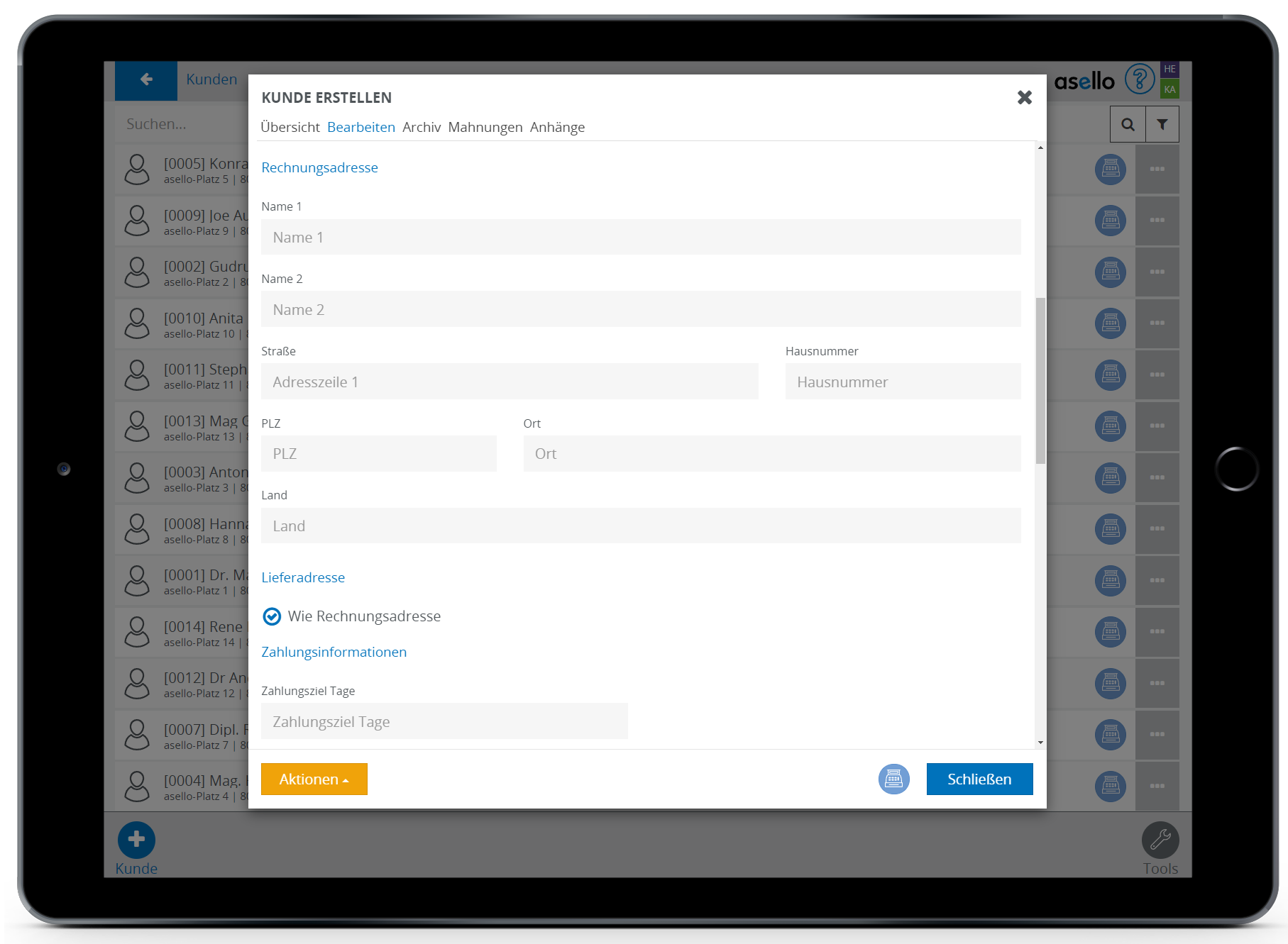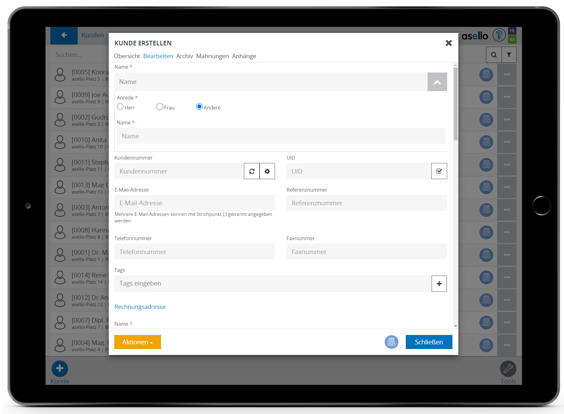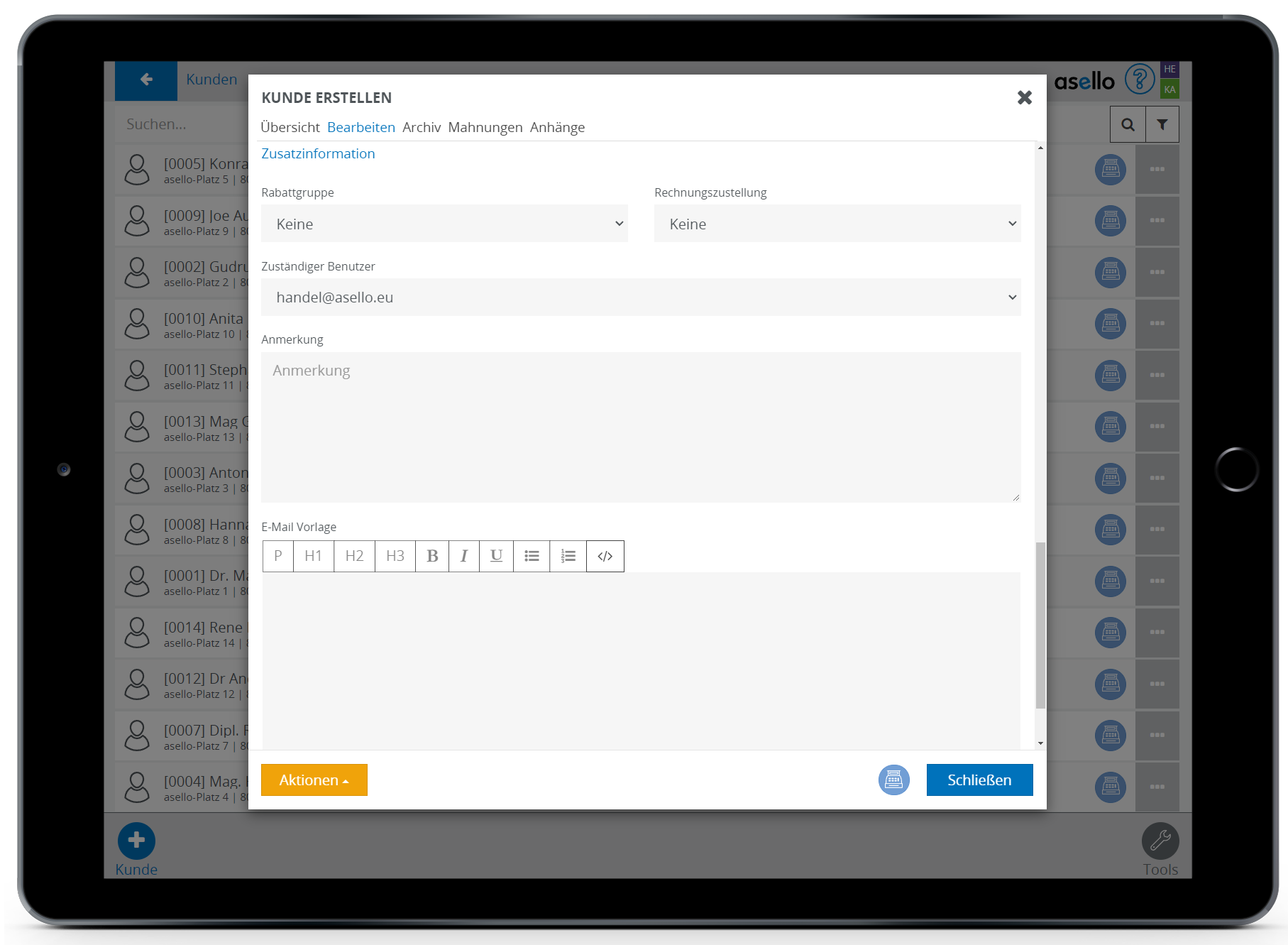 Die bei einem Kunden hinterlegt E-Mail-Adresse wird automatisch verwendet, wenn Sie diesem Kunden aus asello ein Dokument (Rechnung, Auftragsbestätigung, Mahnung) per E-Mail senden möchten.