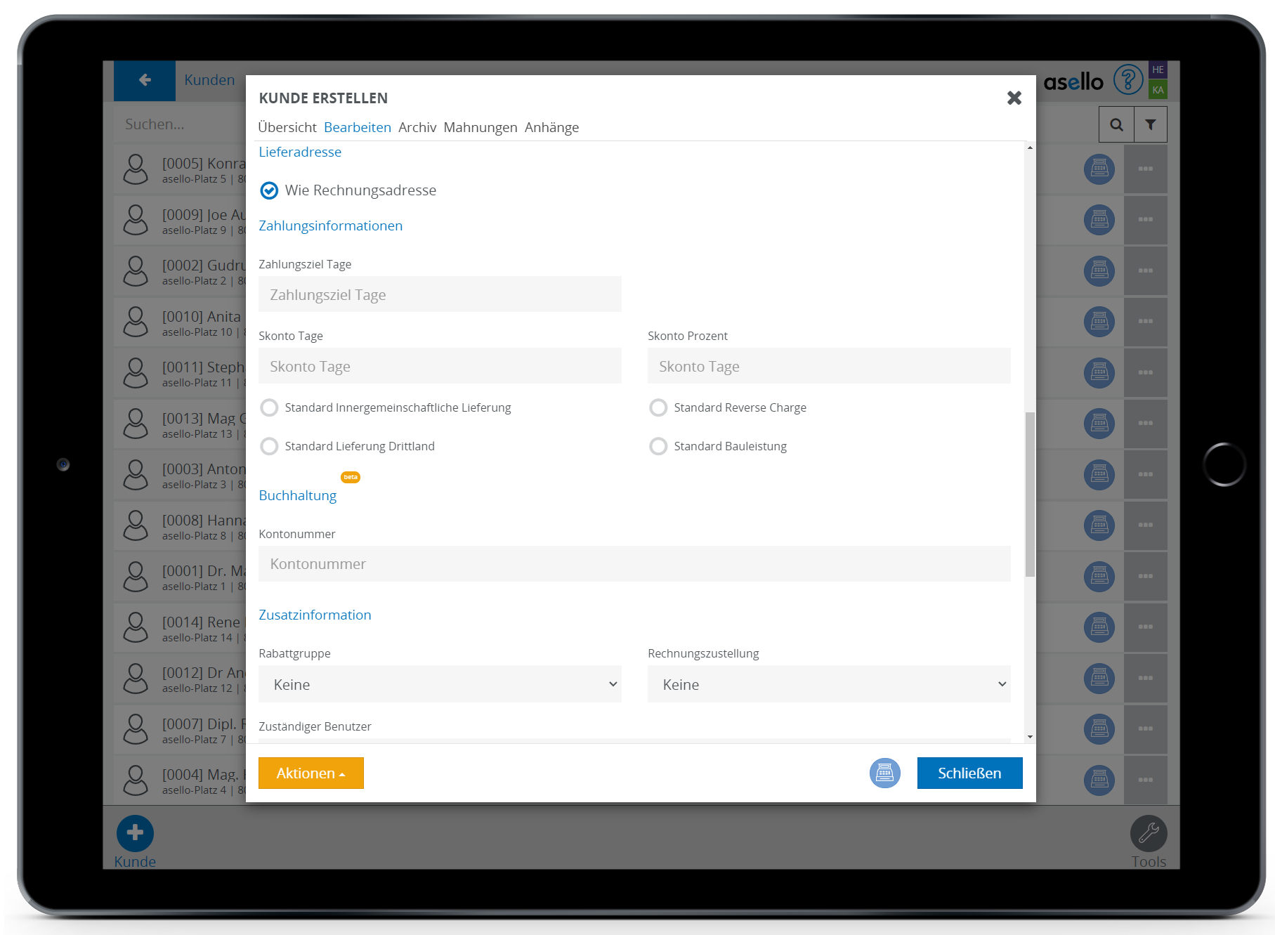 Sie können jedem Kunden auch noch zusätzliche Informationen wie eine Rabattgruppe, die Art der Rechnungszustellung, einen zuständigen Benutzer und individuelle Anmerlungen hinzufügen.