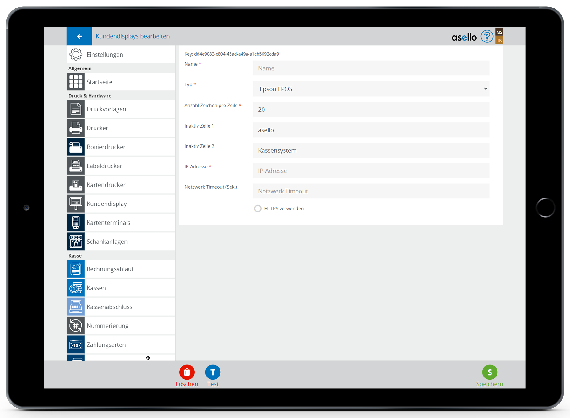 Geben Sie den Namen, Typ und die IP-Adresse des Kundendisplays nun an und klicken Sie anschließend rechts unten auf "Speichern".