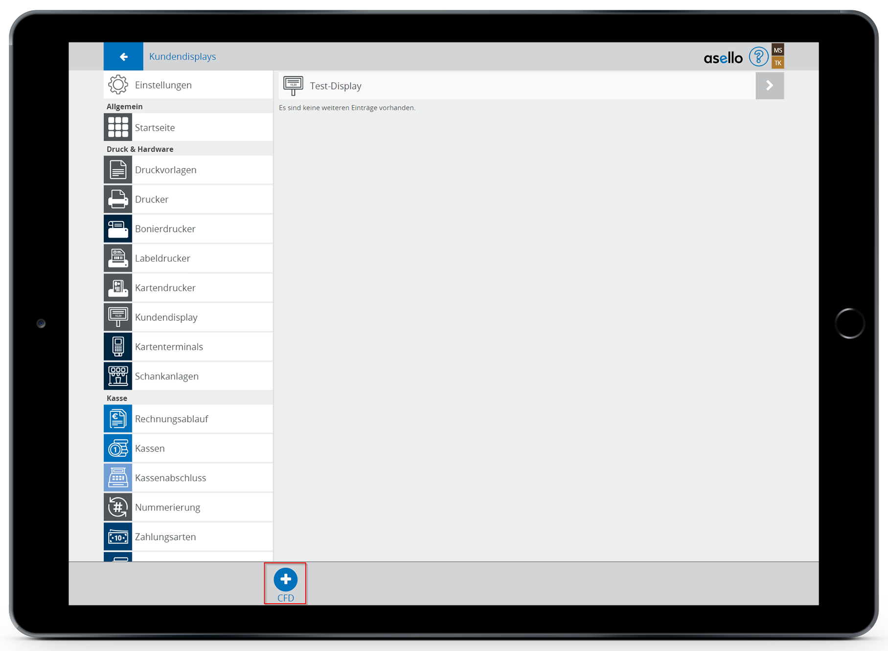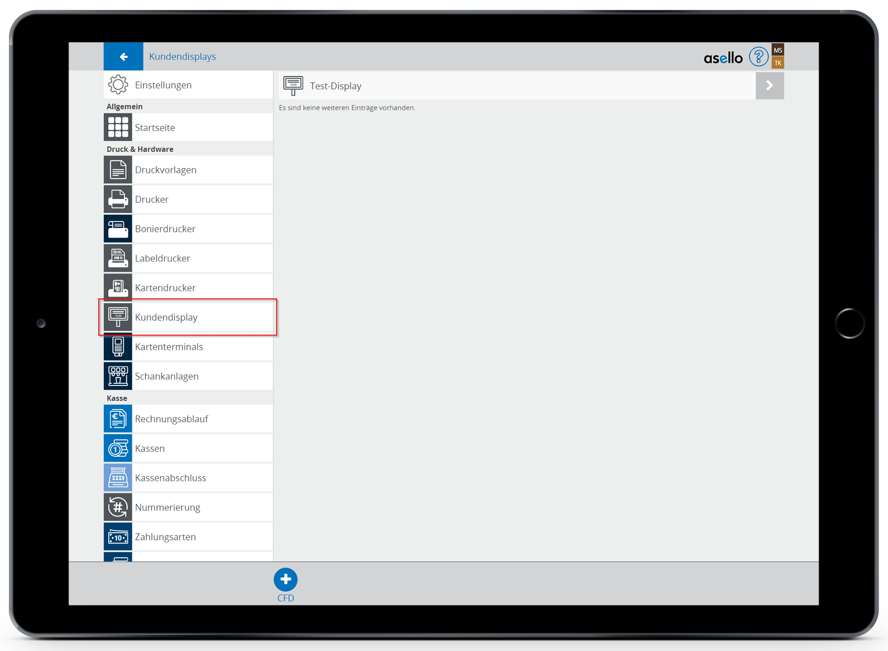 Klicken Sie anschließend in den Einstellungen im Bereich „Kundendisplay“ auf das blaue Plus-Symbol „CFD“ im linken unteren Eck. Es öffnet sich das Bearbeitungsfenster mit den Einstellungsmöglichkeiten des neuen Kundendisplays.