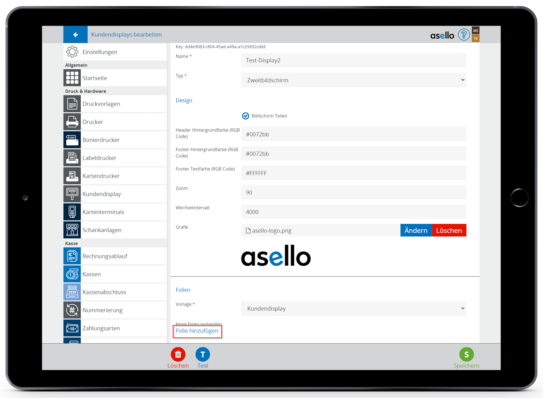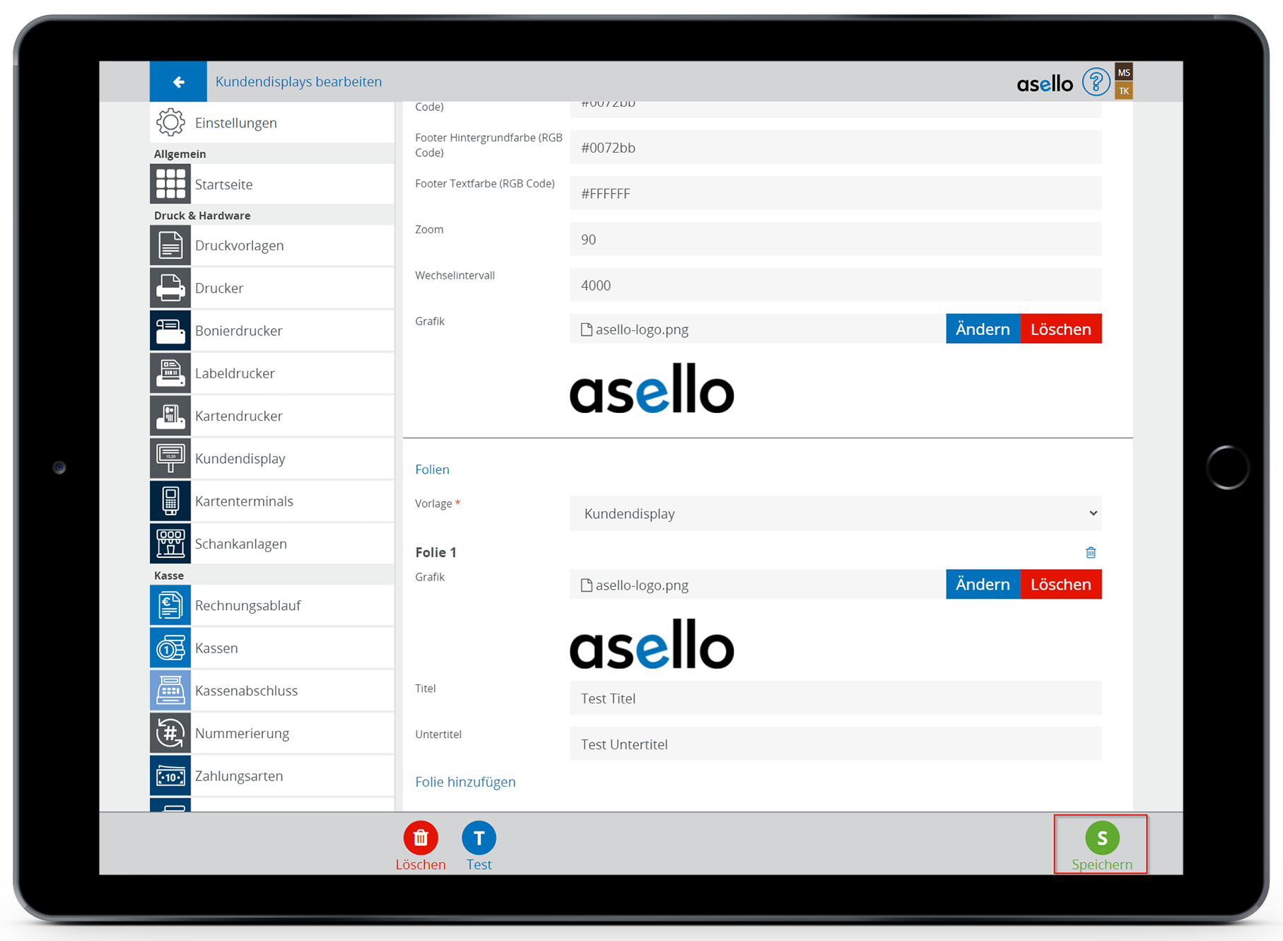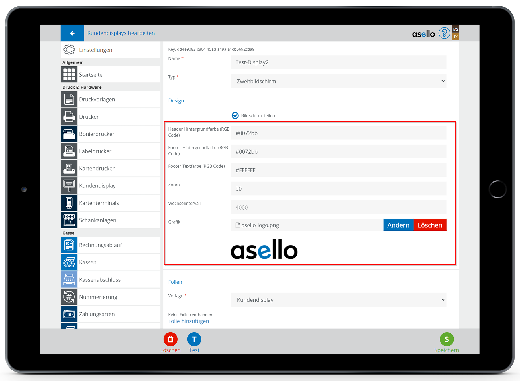 Sie können die Anzeige Ihres Kundendisplays zwischendurch testen. Klicken Sie dazu in den Einstellungen des Kundendisplays auf den blauen Button "Test" im linken unteren Eck.