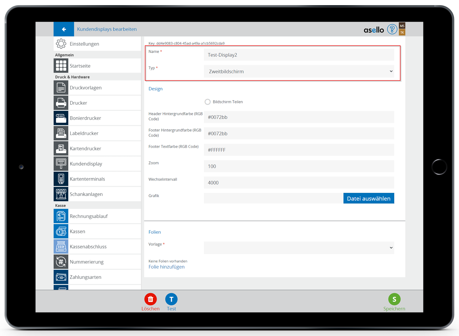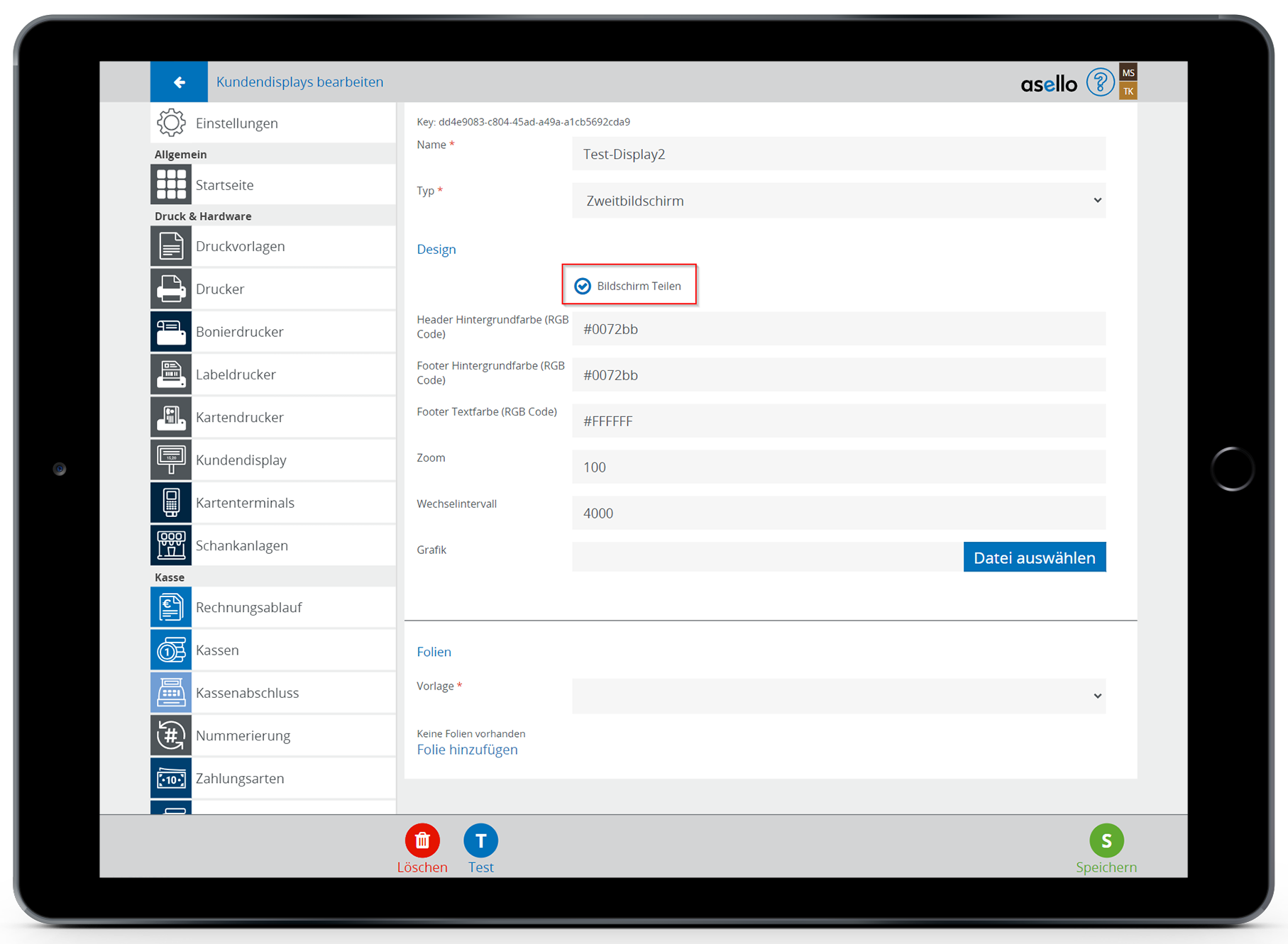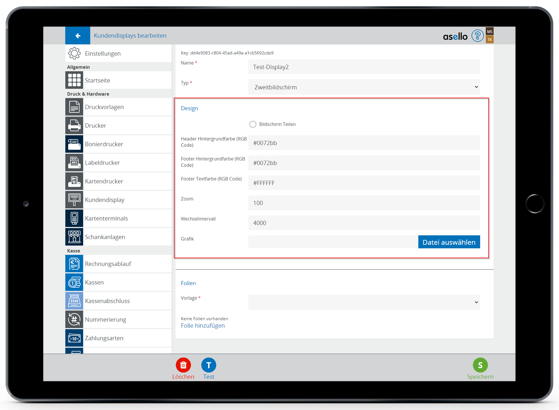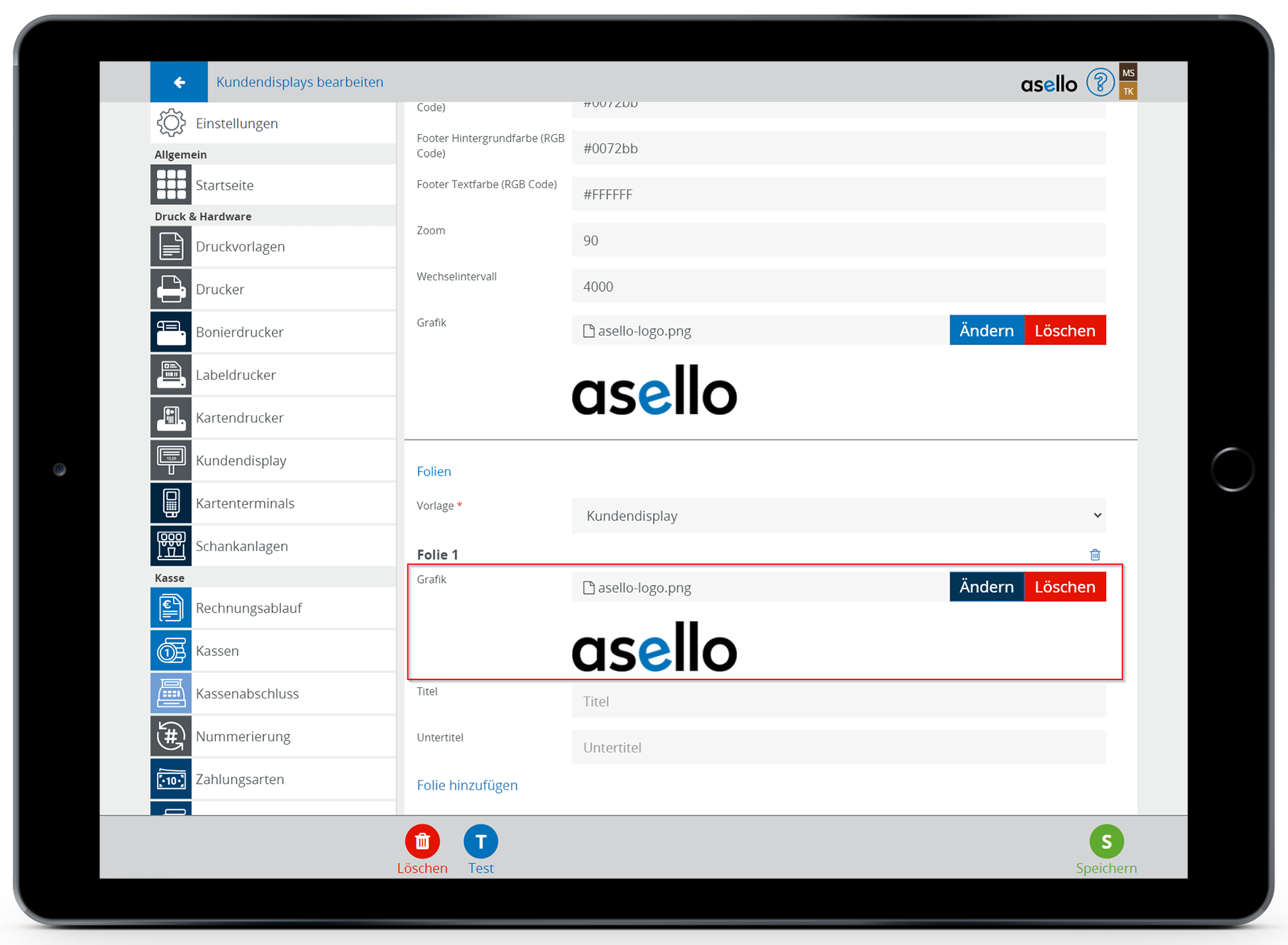 Sie können die Anzeige Ihres Kundendisplays zwischendurch testen. Klicken Sie dazu in den Einstellungen des Kundendisplays auf den blauen Button "Test" im linken unteren Eck.