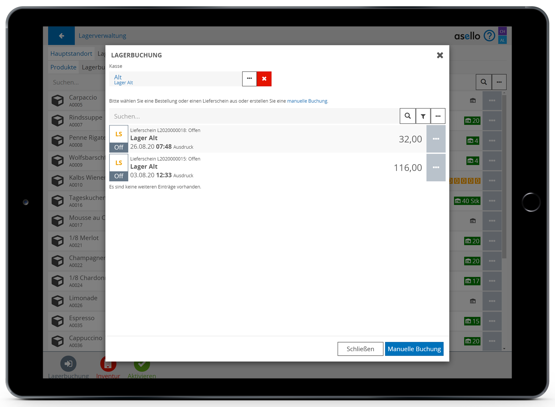 In dem nun erscheinenden Fenster können Sie festlegen für welchen Standort die Buchung durchgeführt werden soll. Dadurch werden Ihnen unterhalb die Lieferscheine und Lieferartenbestellungen des jeweiligen Standortes angezeigt, welche noch nicht im Lager verbucht wurden. Indem Sie auf die gewünschte Zeile klicken, erscheint ein Fenster in dem Sie die Lagerbuchung nochmals überprüfen können und mit einem klick auf den blauen Button „Erstellen", die Lagerbuchung durchführen können.