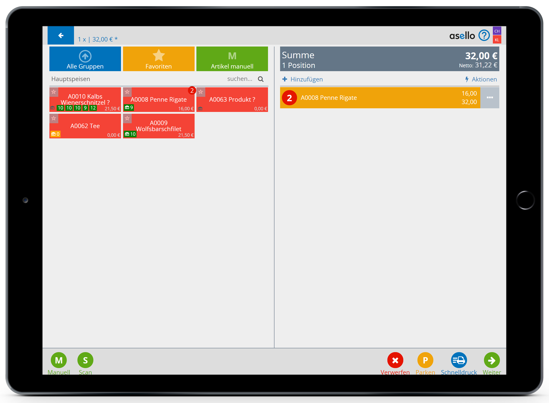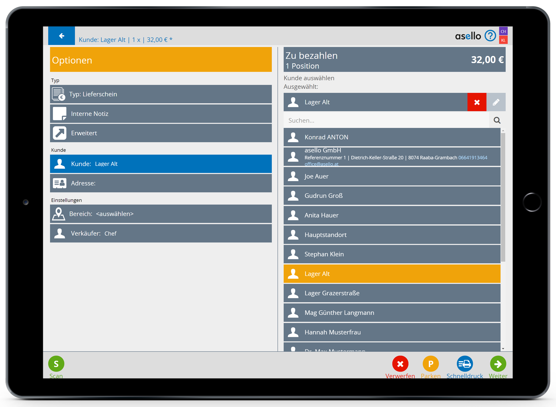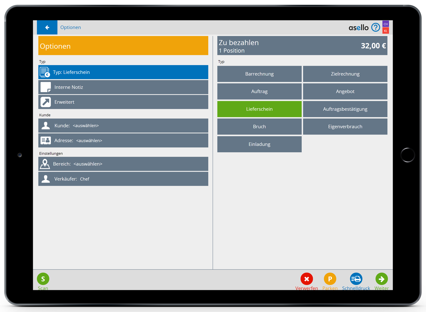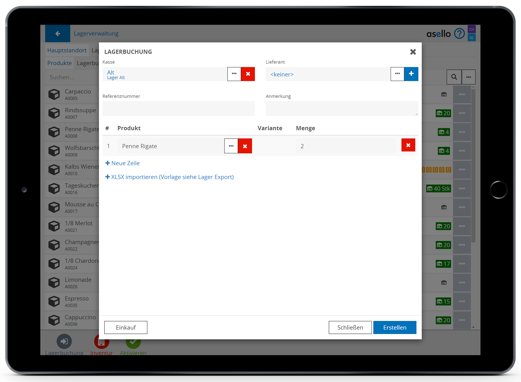 Um einen Lieferschein zu erstellen, klicken Sie auf der asello Startseite auf die Kachel „Neu". Anschließend wählen Sie die gewünschten Produkte aus und klicken im rechten unteren Eck auf den Button "Weiter".