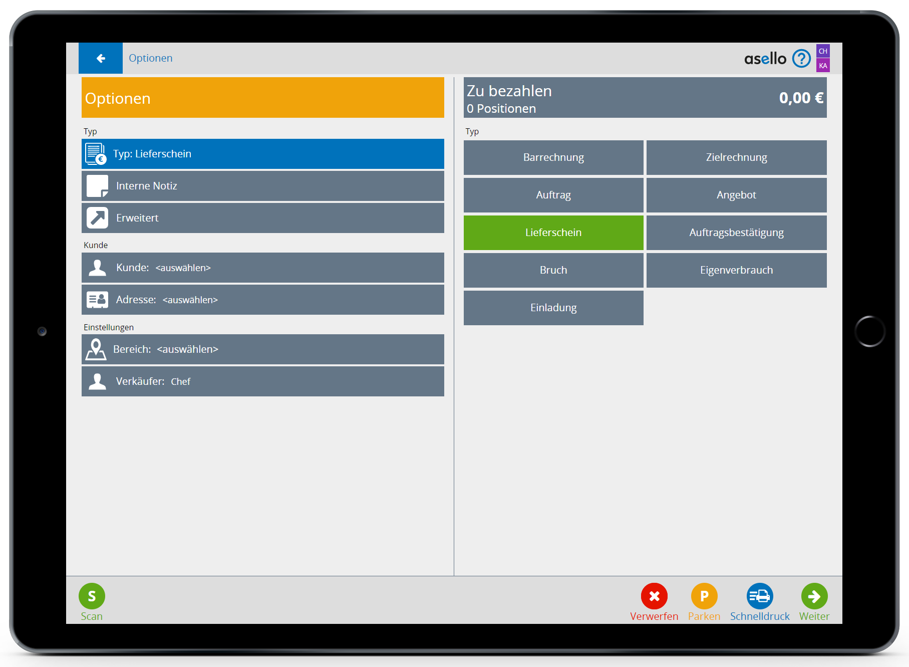 Um einen Lieferschein zu erstellen, klicken Sie auf der asello Startseite auf die Kachel „Neu". Anschließend wählen Sie die gewünschten Produkte aus und klicken im rechten unteren Eck auf den Button weiter.