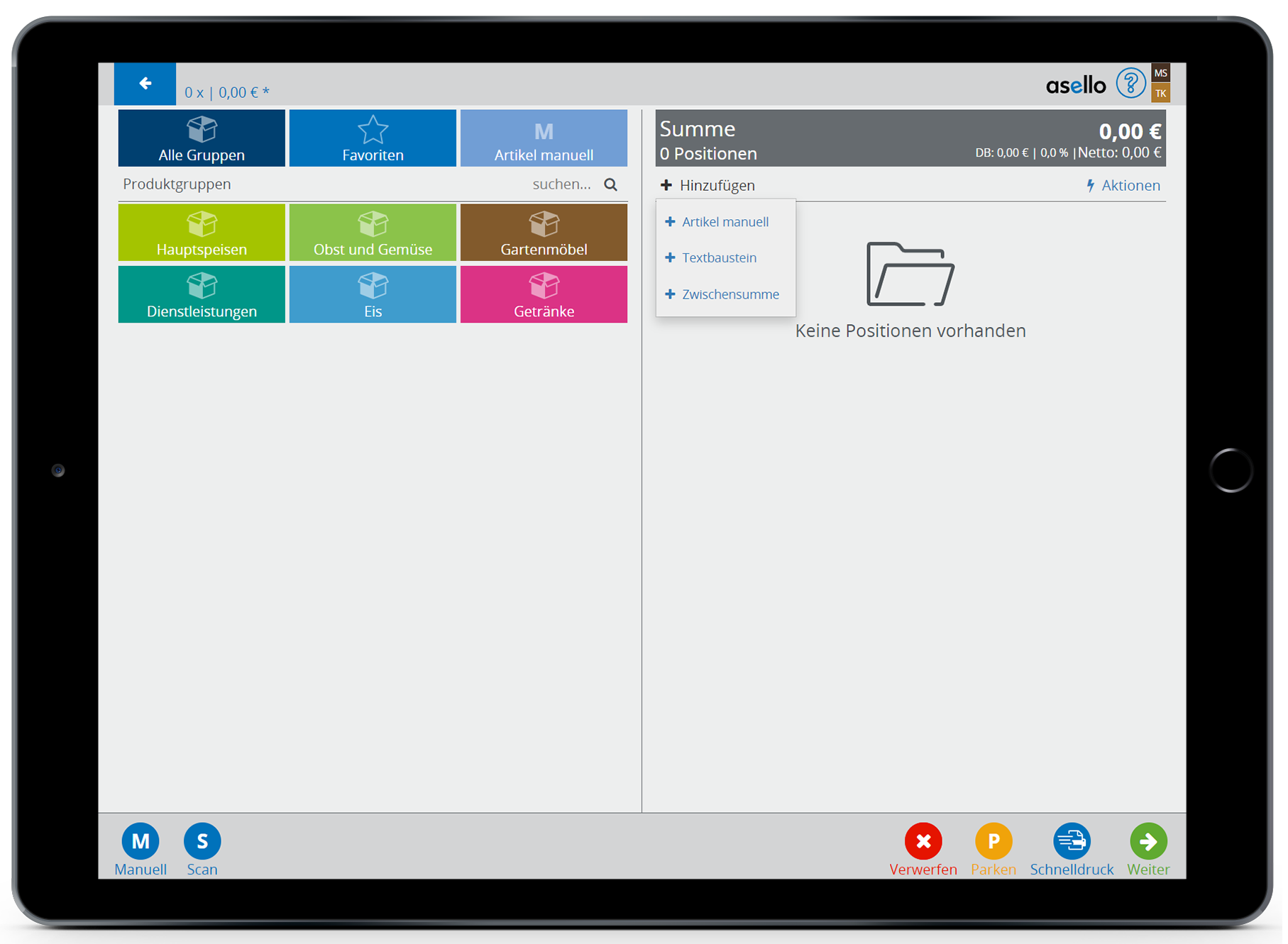 Um der Rechnung nun einen manuellen Artikel hinzuzufügen, klicken Sie entweder ganz oben auf "Artikel manuell", links unten auf den Knopf "Manuell", oder auf der rechten Hälfte unter dem Summenfled auf "+ Hinzufügen" und wählen dort "Artikel manuell".