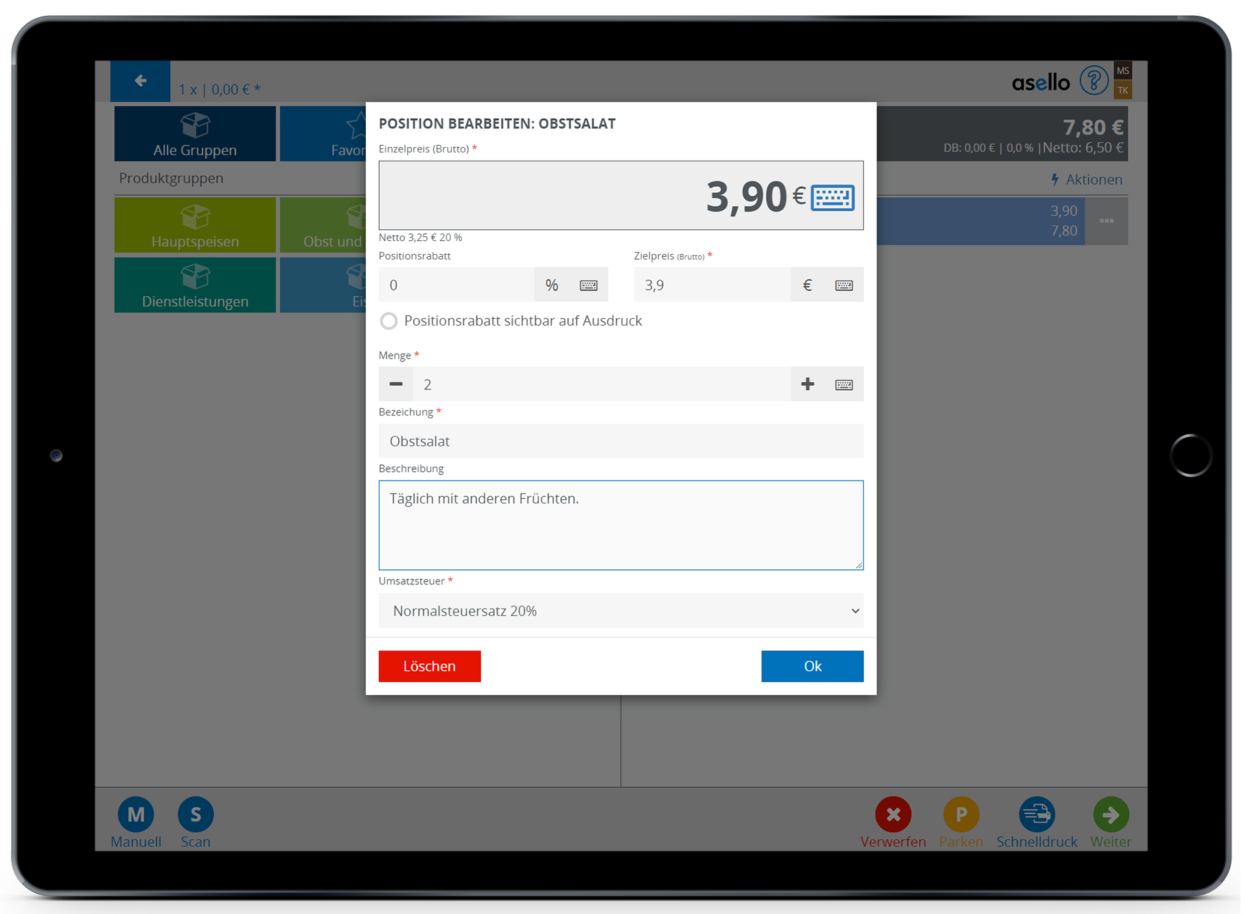 Nun öffnet sich ein neue Popup Fenster, in dem Sie den manuellen Artikel konfigurieren können. Hier können Sie den Bruttopreis, Rabatt, Menge, Bezeichnung, Beschreibung und Steuersatz für den Artikel angeben.
